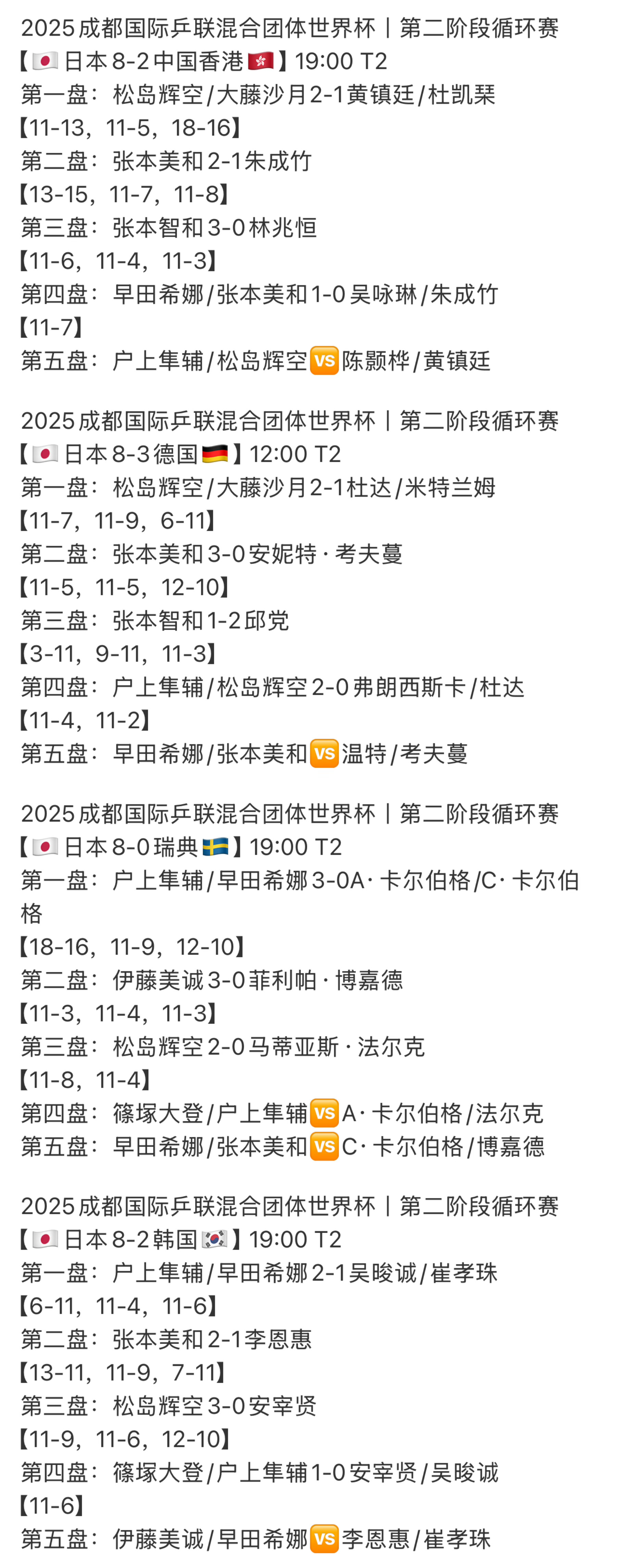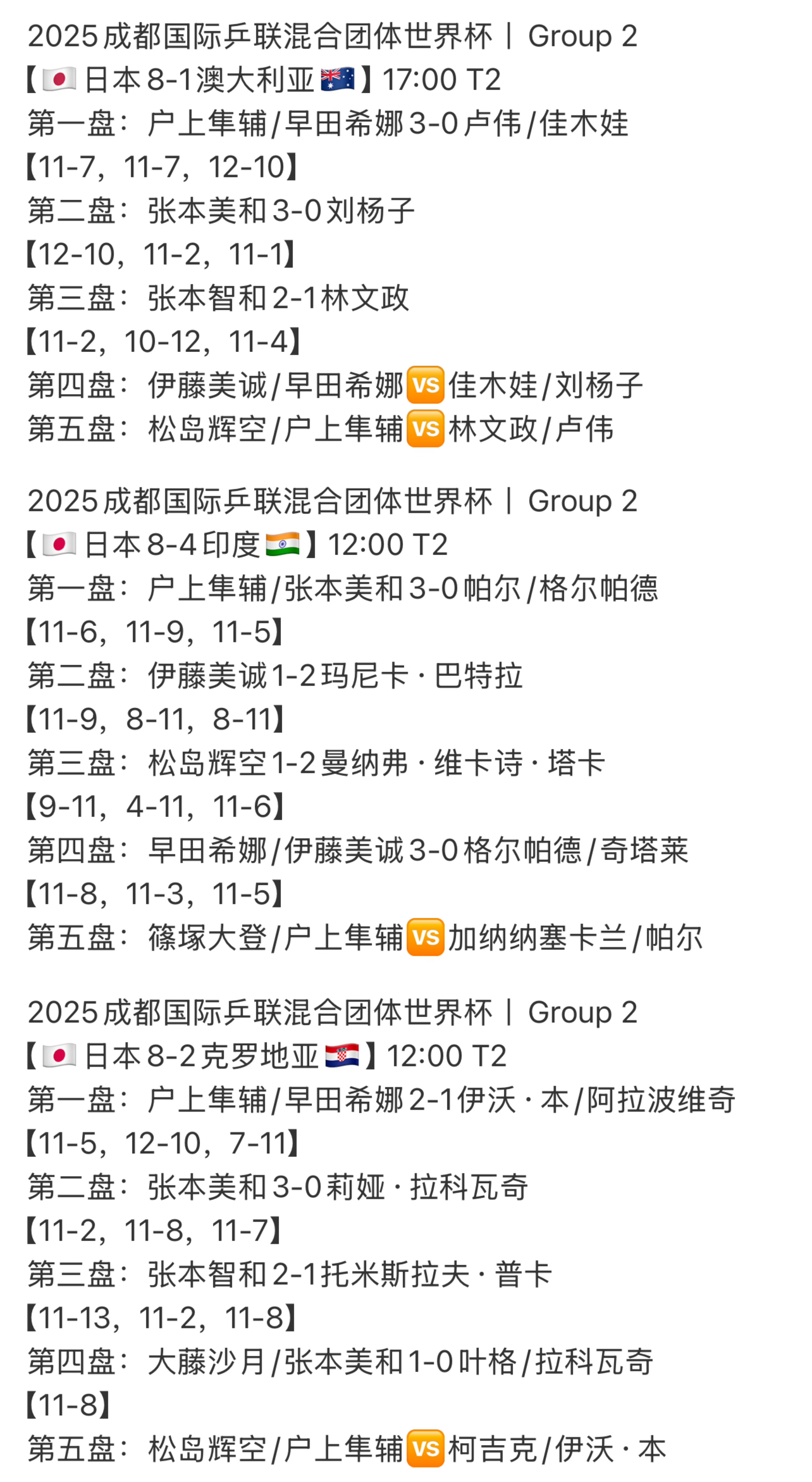 🇨🇳:混双2种,女单3种,男单3种,男双5种,女双2种。(7场比赛 男双竟然排过5种)🇯🇵:混双3种,女单2种,男单2种,男双2种,女双3种。(男双女双一局没丢)