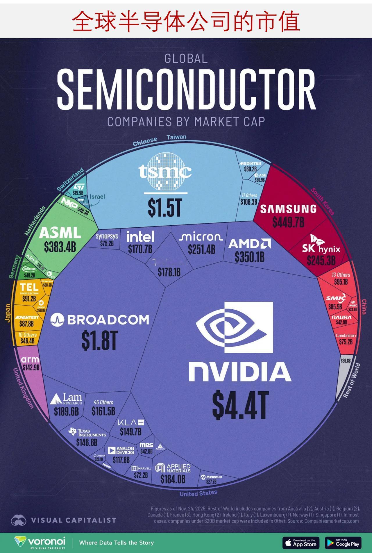 图说全球半导体公司的市值,英伟达约占全球该行业总市值的 37% 半导体产业为当今世界的几乎所有事物提供了动力,从智能手机到汽车皆是如此。到 2025 年,该行业的市值已超过惊人的 12 万亿美元,这凸显了其在训练和部署人工智能工具方面所发挥的关键作用。 在下面这张图表中,根据截至 2025 年 11 月 24 日的市值情况,展示了全球半导体公司的市值。 此图表所使用的数据来源于 CompaniesMarketCap.com 网站。“世界其余国家”这一类别涵盖了来自 11 个国家的 16 家公司。 ——美国企业引领市场 美国企业在这行业的总估值中占据了绝大多数份额,其总估值超过 7 万亿美元。 仅英伟达一家的市值就达到了 4.4 万亿美元,约占整个全球该行业总市值的 37%。该公司的芯片被广泛用于开发和运行现代人工智能工作负载,为从大型语言模型到自动驾驶汽车等各种设备提供动力。其他领先的美国企业包括博通(1.8 万亿美元)和 超微半导体公司(3500 亿美元),这两家公司都已与 OpenAI 签署了 2025 年的巨额协议。 请注意,这三家公司均为无晶圆厂半导体公司,这意味着它们自行设计芯片,但实际生产则由台积电等制造商负责完成。 ——台湾地区的半导体巨头 台湾地区仍是全球芯片制造的重要一环,台积电是全球最大的芯片代工企业。该公司目前正向美国扩张,在亚利桑那州新建了多个晶圆厂,并且这些工厂得到了拜登政府《芯片与科学法案》提供的数十亿美元的激励资金支持。 台湾地区第二大半导体公司联发科技是一家主要的移动和连接芯片组设计商,为众多知名消费电子品牌提供的处理器用于智能手机、智能电视以及汽车系统等。 ——欧洲的战略定位 欧洲虽然整体市场规模较小,但在半导体设备和设计领域发挥着至关重要的作用。荷兰的阿斯麦公司(ASML)市值达 3830 亿美元,是全球唯一一家提供极紫外光刻技术的供应商。 由于美国实施的出口限制以及荷兰政府的支持,阿斯麦公司不会向中国出售其最先进的光刻设备。