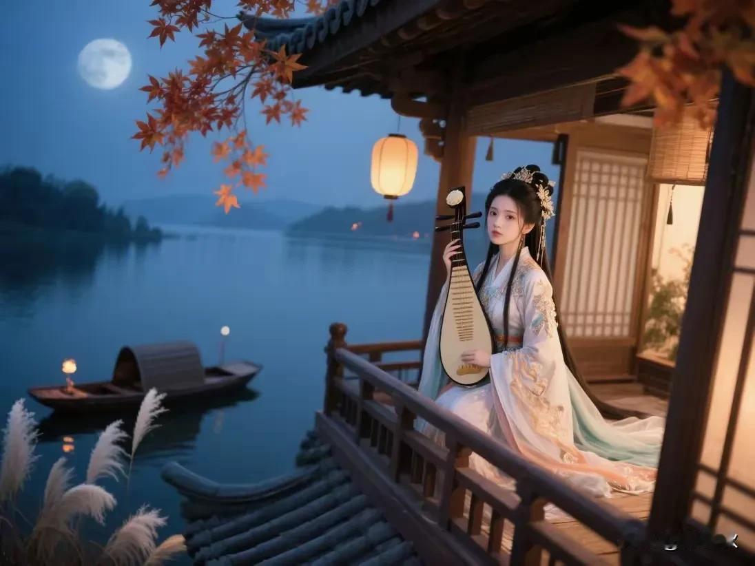 栀夏续句诗: 枫染江天别样愁, 弦凝冷月水亭幽。 归舟误尽灯花老, 琵琶声声惹烦忧。