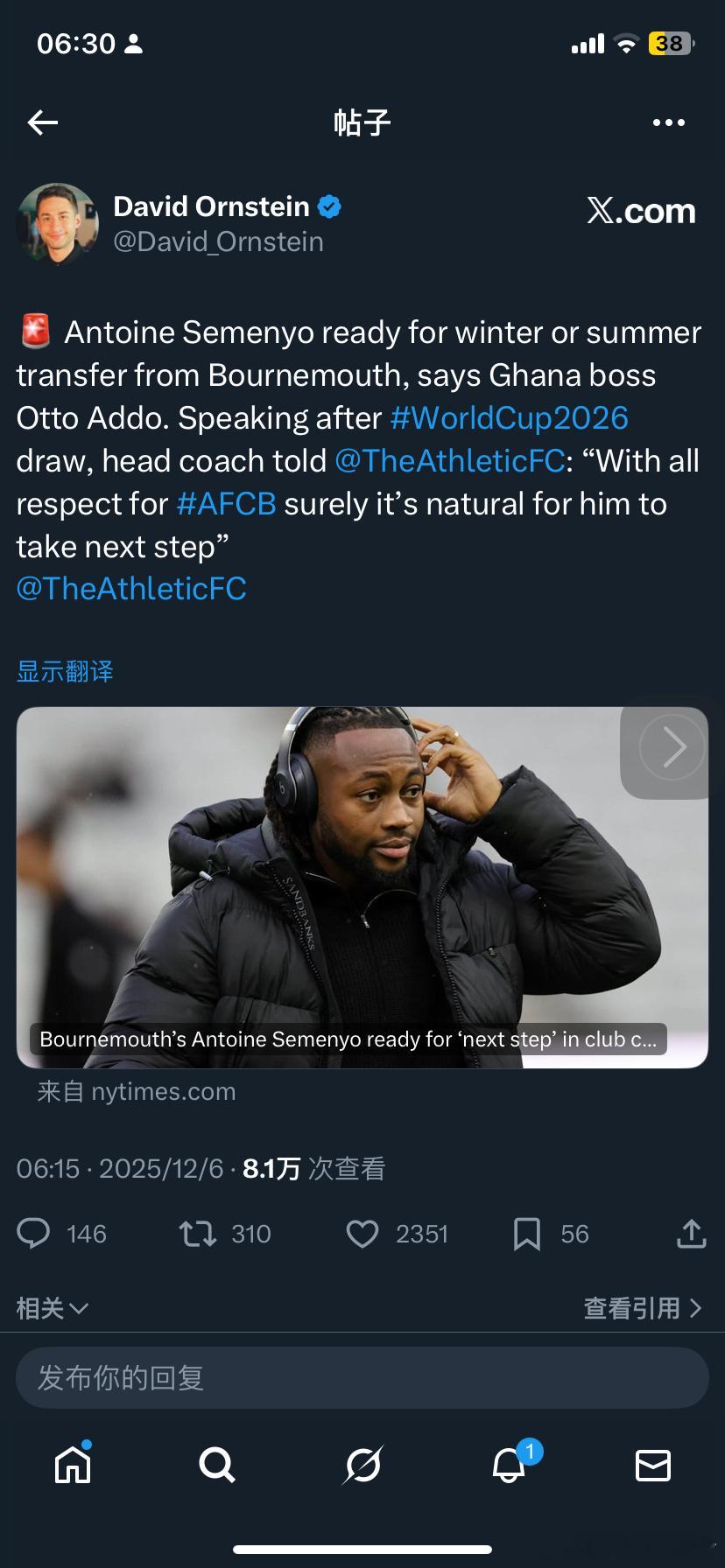 加纳主帅奥托·阿多透露塞梅约已准备好在冬季或夏季从伯恩茅斯转会:"他在伯恩茅斯表现得非常出色,虽然我们尊重伯恩茅斯俱乐部以及他们所做的事情,对他来说,迈出下一步自然是顺理成章的。""无论这一步是在冬窗还是夏窗,这是另一个问题,但对我们来说没有区别。我期待他向世界更多地展示他的实力。"