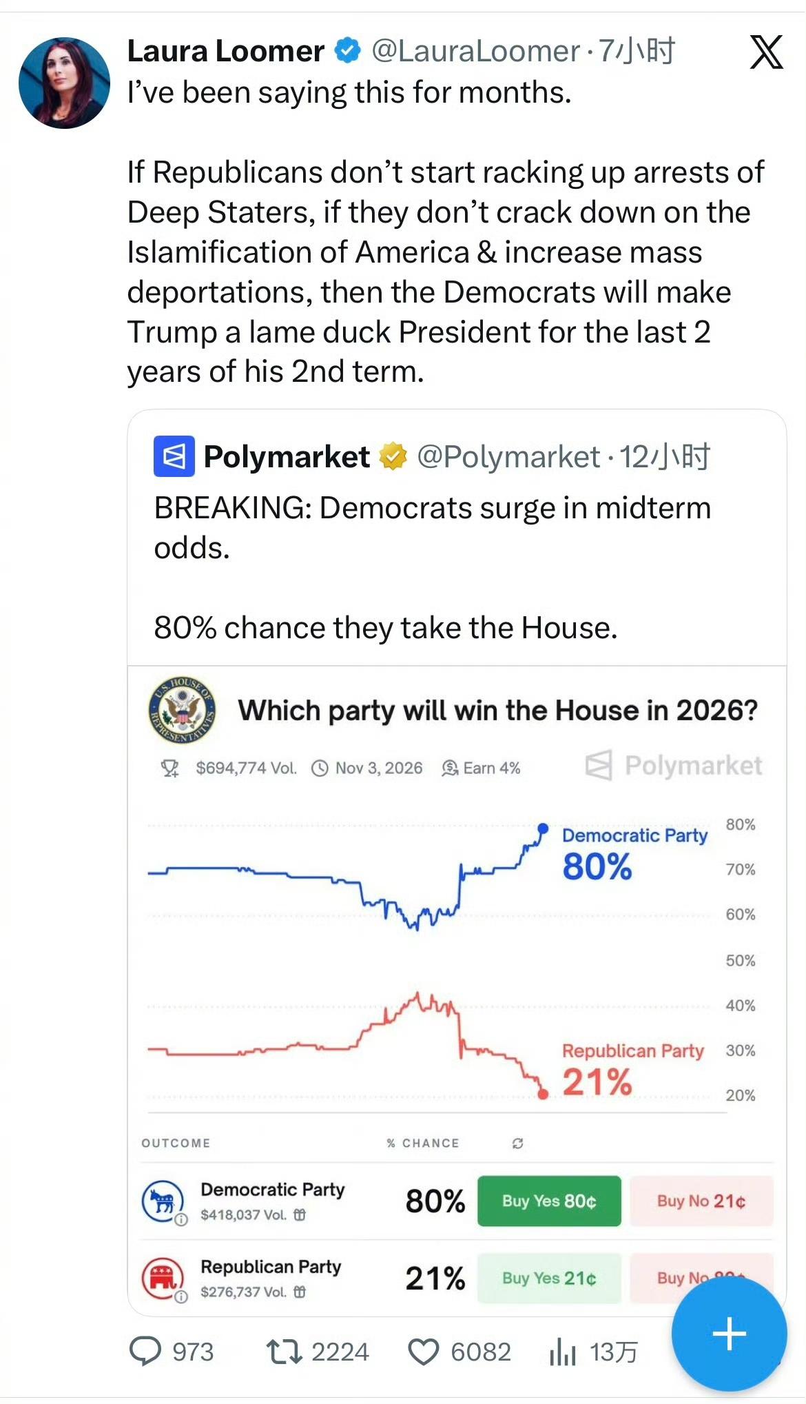 “人类目前最准确的预测工具”——预测网站Polymarket预测:2026美国中期选举,民主党有80%的概率拿下众议院。 最新一届加拿大、澳大利亚大选都预测对了。 劳拉·卢默一针见血地指出:都是因为队伍不够纯洁不够忠诚,清君侧不够彻底,没有把深藏在队伍内部的坏人抓出来,驱逐移民和反绿力度不够……才导致MAGA事业受损,支持率下降。