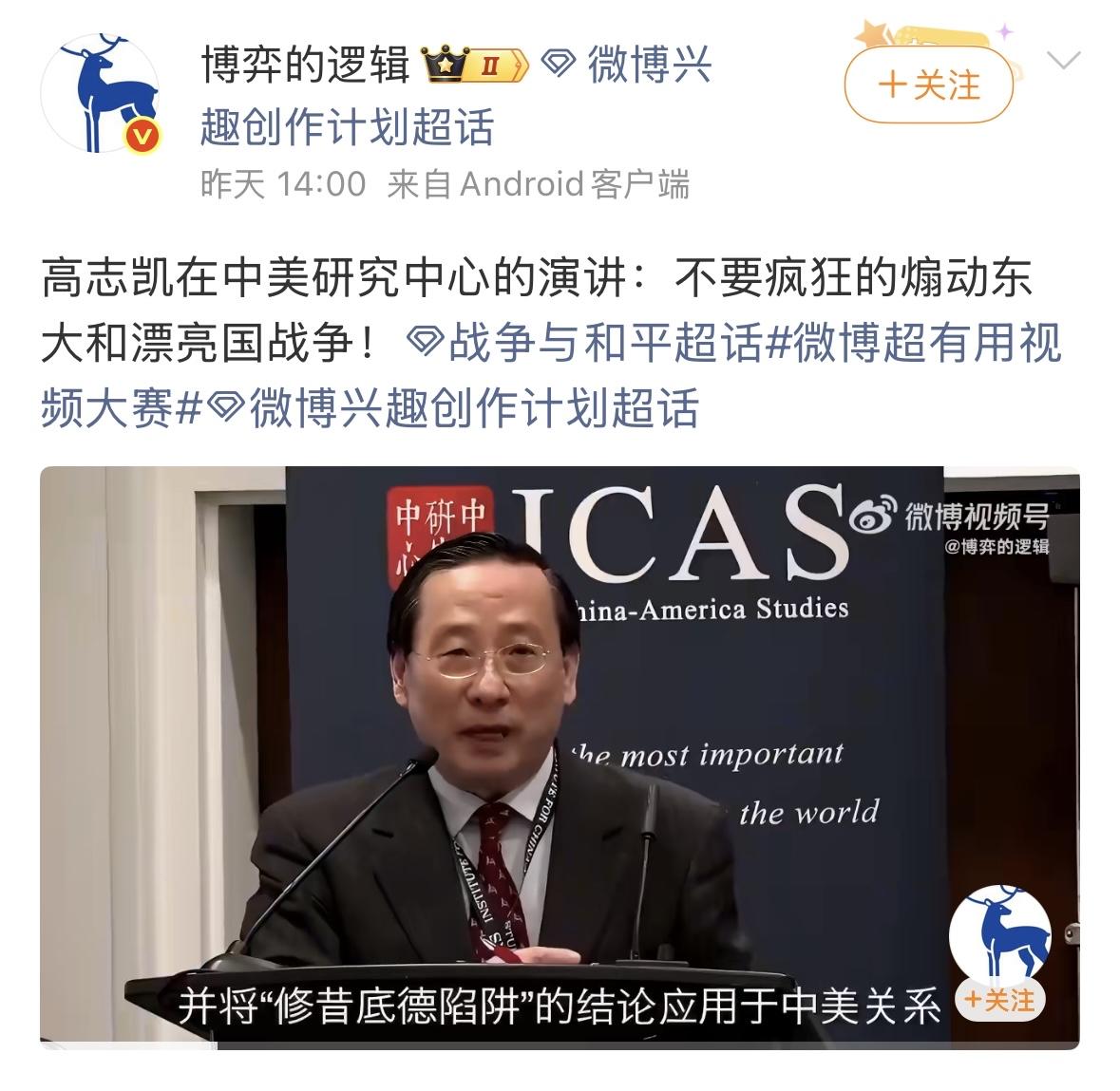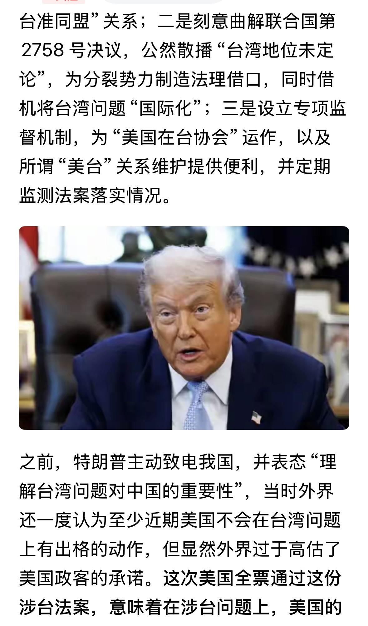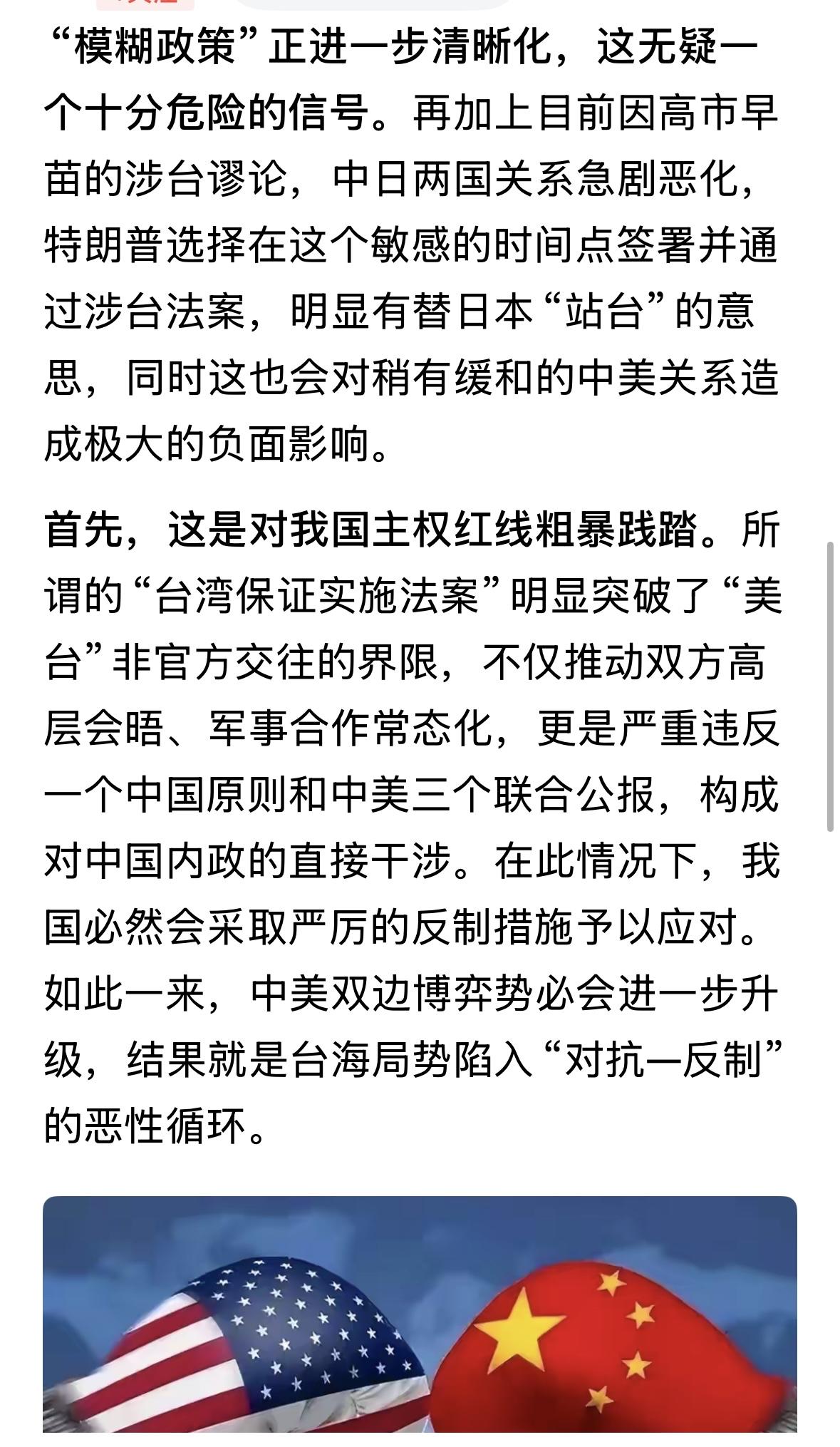 川普签署“台湾保证法案”,严重干涉中国内政,将美台半官方关系公开化,性质非常严重,比高市早苗的言论更恶劣,高市早苗言论虽然也是日本官方立场,但是,是以个人言论形式抛出来的。美国这个是国会通过的法案,已经总统批准实施,已经确定为官方文件。高志凯在中美研究中心的演讲,不要疯狂的煽动东大和漂亮国战争!具有深刻含义,不知道你怎么理解,这与高志凯以前的风格大相径庭,不跟傻子们共振了?还是说,虚晃一枪?