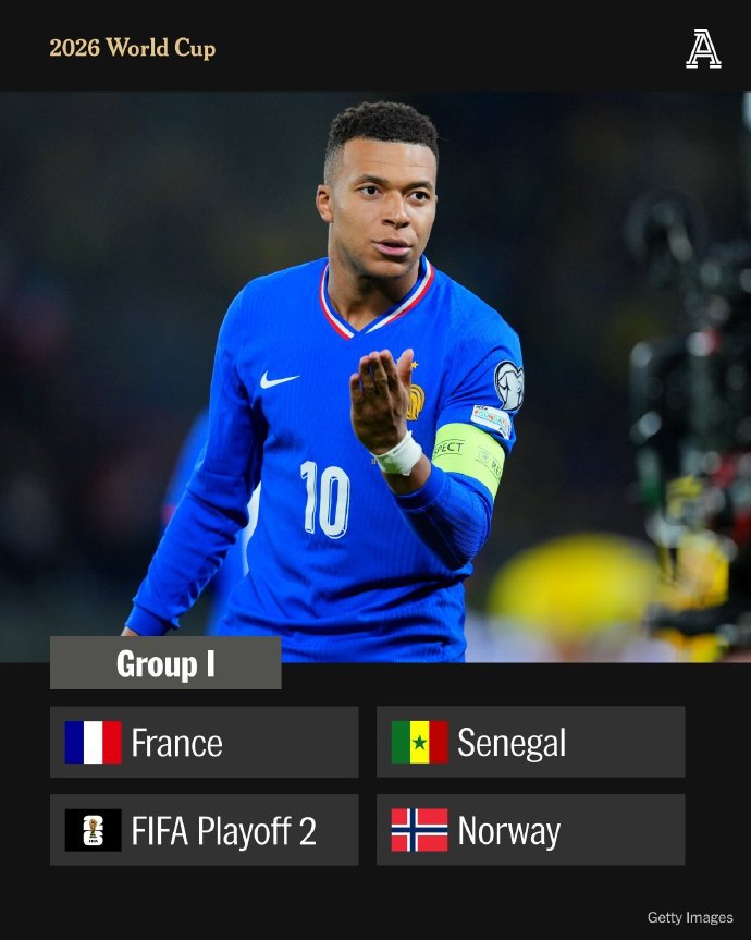 I组:法国、塞内加尔、洲际附加赛2组胜者、挪威