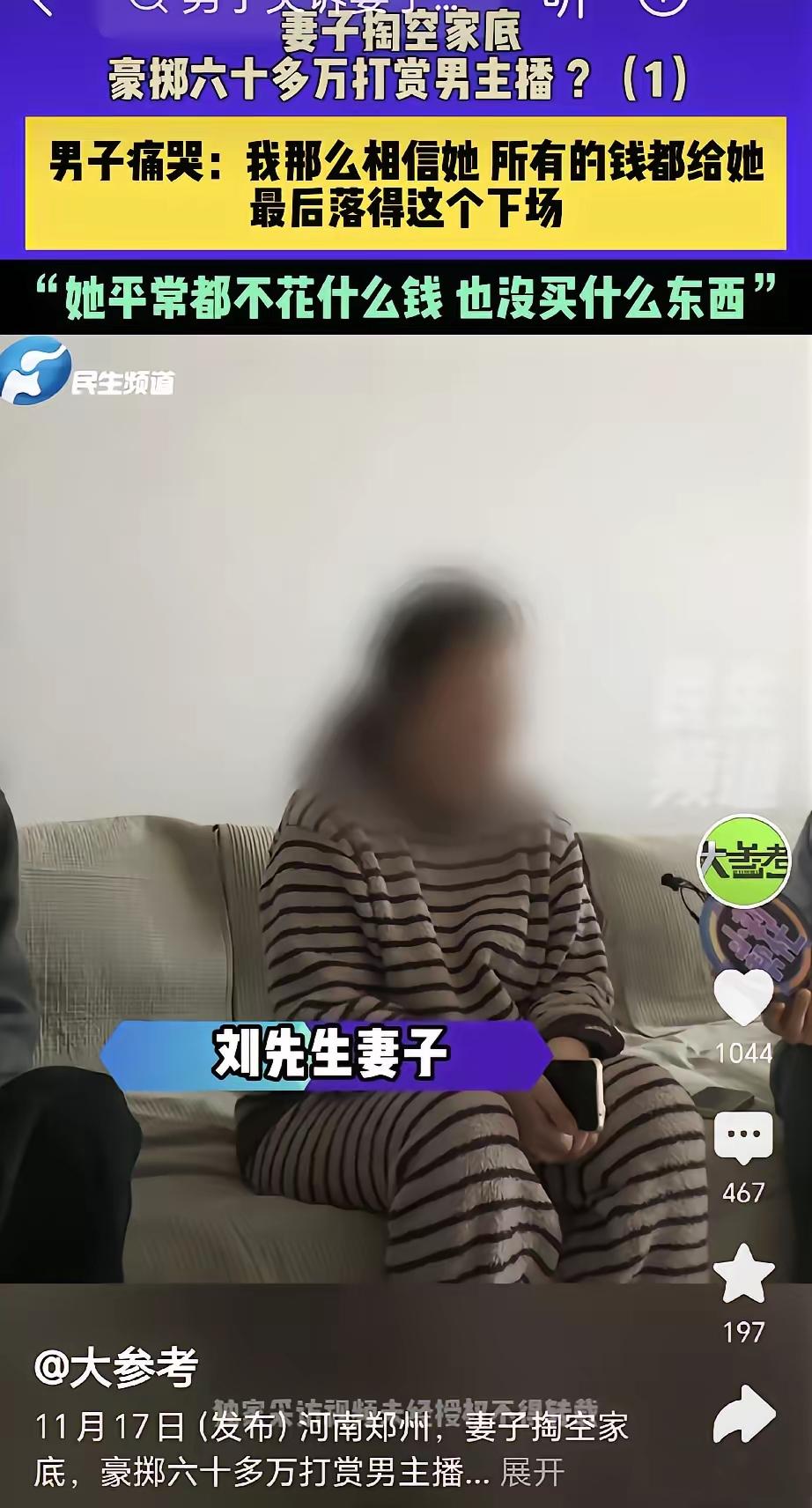 天都塌了!河南郑州,一男子结婚8年,省吃俭用存了116万,他交给妻子保管,谁知查账时发现,妻子账上只有3毛钱,男子这才知道,67万被妻子打赏给了男主播,其余的钱,妻子支支吾吾说不清楚,男子还发现,不但积蓄没了,妻子还借了80000元网贷,妻子: 他叫我宝宝,忍不住上头了,男子大哭: 我那么相信她,钱都给了她,却落得这样下场… 网友评论: 国家早就应该限额打赏,每天同一帐户最高限额不能超过50元,一月内累积打赏不能超过500元,一年内不能超过1000元 越是不上班的女人,花钱越是出手大方,她不知道挣钱有多么的来之不易。这个女人也太不可思议了,超出了常人能做的事情。 这个男人了不起,每年净利润十二万多元人民币,不知道要有多累多辛苦。 对于直播,看看就行,千万别头脑一热就去打赏!这么多年,对于主播在直播间声嘶力竭地喊叫,一口一个家人们、大哥们,我一分钱也不给她!