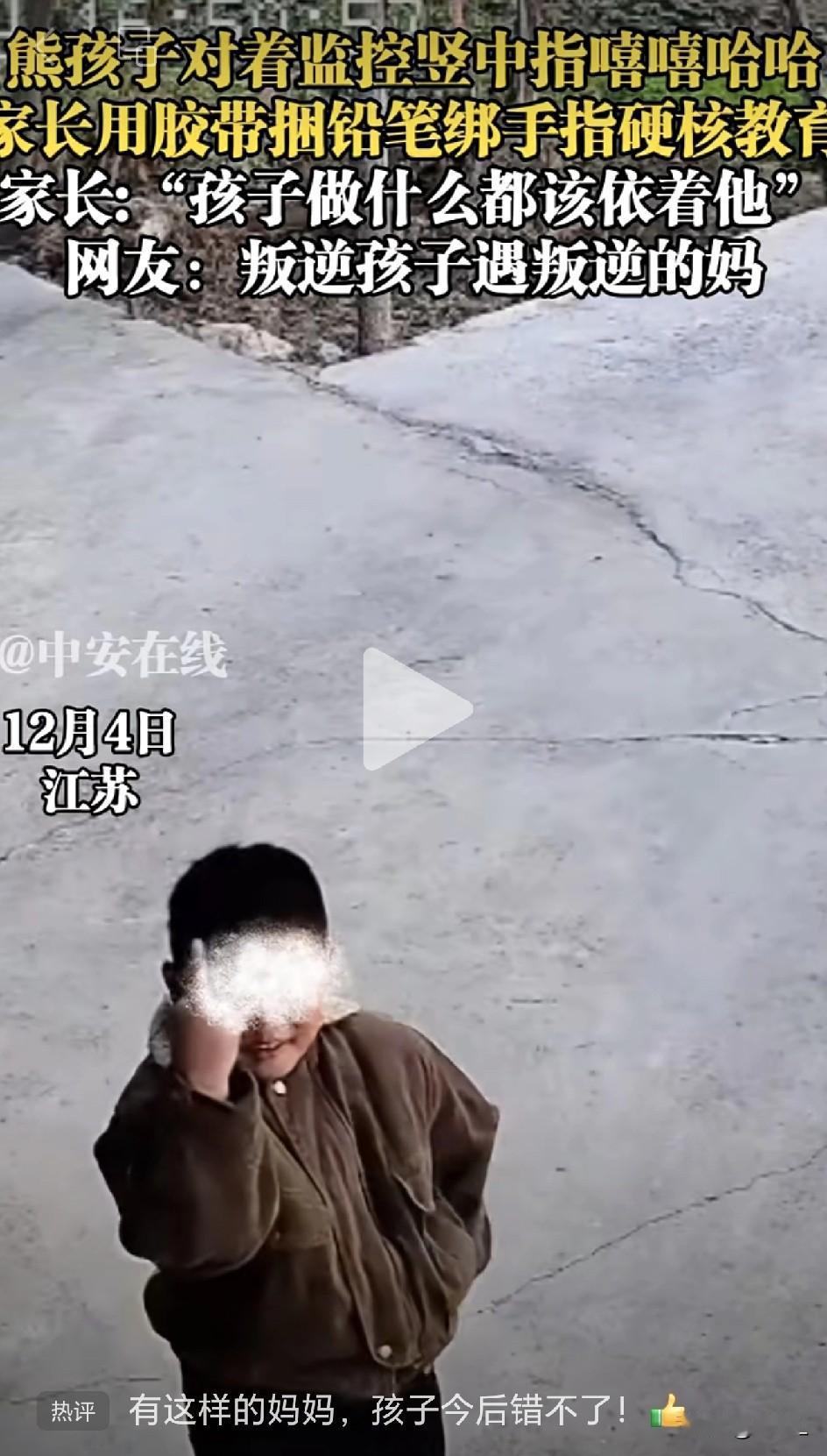 熊孩子冲监控竖中指挑衅,本以为“天高皇帝远”,谁知亲妈出手直接封神!网友:用魔法打败魔法! 近日,江苏,一名熊孩子对着监控竖起了中指,满脸得瑟,大概是觉着挑衅家长,家长又打不着他,心里正美。 让他没想到的是,事情很快就悲剧了! 妈妈发现了他的挑衅行为,回到家,一没打二没骂,而是用胶带把他的中指和铅笔绑在一起,还必须一直竖着,让他“一次竖个够”。 妈妈的这一硬核操作,直接把熊孩子干蒙了,哭着说自己错了。 网友们纷纷怒赞,这是叛逆孩子遇叛逆的妈,走孩子的路让他无路可走: “作为老师,我要表扬这位妈妈!” “作为家长,我也支持这位妈妈!” “这妈妈肯定能把娃管好,支持!” “竖个痛快!亲妈无疑!” “这个办法可以借鉴!” “别人打,不如自己打!” “以彼之道还施彼身!” “哈哈哈这下再也不敢了吧!小时候不管长大出社会被人教育的,还是自己教育好。” “用魔法打败魔法……给妈妈点赞!” 评论区瞬间变成“治娃经验交流会”: “有一次我女儿学别人,打我的脸,我直接一巴掌过去,她惊呆了……” “儿子洗澡老故意泼水,弄我一身湿,劝三次还不听,被我拿花洒劈头盖脸一顿喷,从此乖乖洗澡。” “高一晚自习,我们几个后排的嗑瓜子,被班主任逮着了,然后他去买了几斤瓜子让我们站在讲台上一直嗑瓜子……” 说到底,熊孩子不是天生“熊”,只是缺一顿“到位”的教育。这位妈妈用最低的成本,做了最深刻的教训——不伤身,只长记性。 你身边有类似的“硬核教育”名场面吗?欢迎评论区聊聊! 信息来源于中安在线,侵联删!