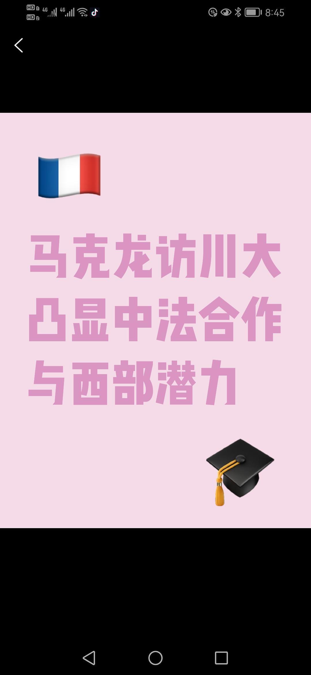 马克龙为何专程访川大?背后藏三重深意 2025年12月5日,法国总统马克龙的成都之行格外引人关注——他避开北上广顶尖高校,直奔四川大学,这场看似“非常规”的访问,实则是中法合作的精准布局。 川大与法国的“交情”是核心诱因。该校已与巴黎政治学院、图卢兹大学等法方顶尖学府签近20份协议,覆盖联合培养、新能源科研、师生互访等领域,2024年双方智能农业无人机项目还获中法创新奖。马克龙此行不仅现场检阅合作成果,更宣布启动“中法未来学者”计划,给川大学子留全额奖学金名额,为人才交流再搭桥。 选川大也是看中中国西部的潜力。成都是西部中心城市,GDP超2万亿,空客、达能等法企早已扎根,中欧班列更打通贸易通道。川大的航空、能源专业与法方产业高度契合,马克龙借访问传递信号:法国想深化与西部在新能源、数字经济等领域的合作,抢占内陆市场新机遇。 此外,历史情谊与民心相通是重要加分项。1981年成都与蒙彼利埃结为中法首对友好城市,44年民间交流筑牢基础。马克龙在川大与学子圆桌对话,用中文问候、引杜甫诗句,还收下熊猫贝雷帽水墨画,亲民互动让中法友好扎根青年一代。 这场访问不止是校园交流,更是中法务实合作与文明互鉴的缩影——从教育纽带到产业对接,从地方情谊到青年对话,川大这一站,藏着中法关系向深向实的密码。