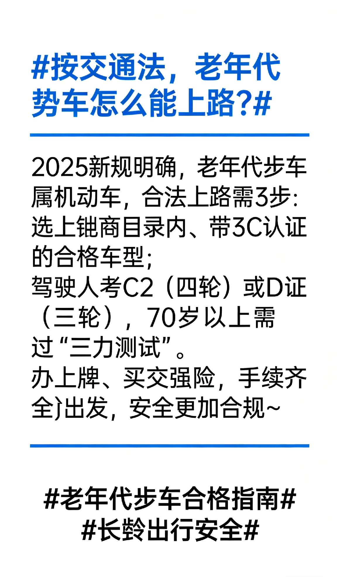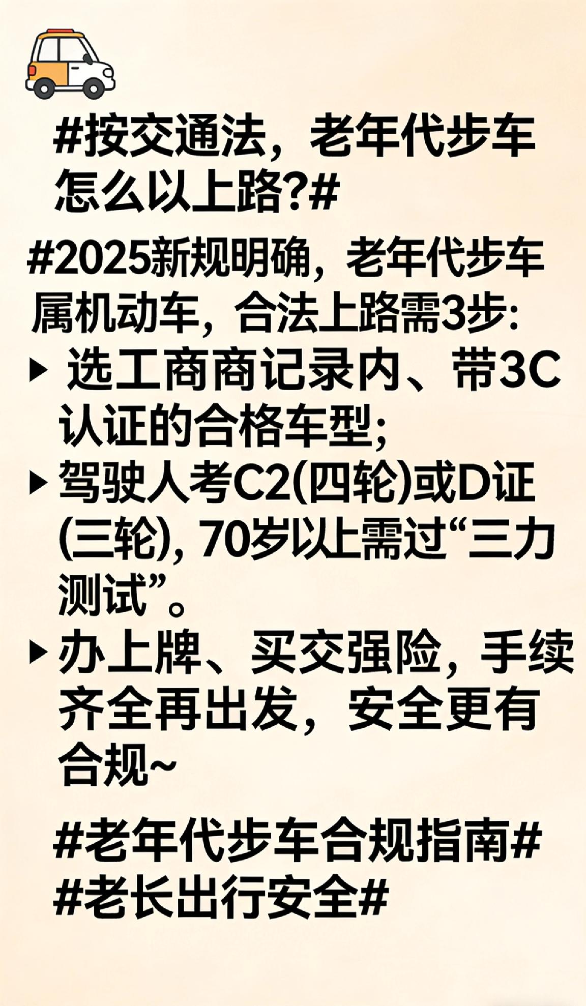 按交通法,老年代步车怎么能上路? 2025新规明确,老年代步车属机动车,合法上路需3步:选工信部目录内、带3C认证的合规车型;驾驶人考C2(四轮)或D证(三轮),70岁以上需过“三力测试”;办上牌、买交强险,手续齐全再出发,安全又合规~老年代步车合规指南