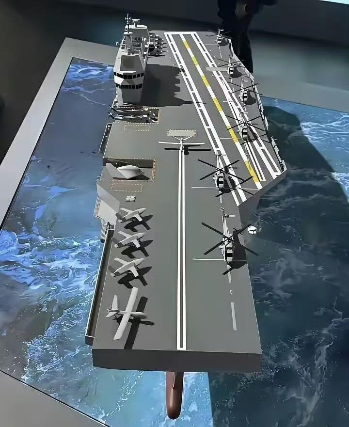 传说中076两栖攻击舰的改进型,最明显的特征就是斜通式甲板,增加了一条弹射起降的跑道。 其实就变成了一艘轻型的航空母舰,但是又比航空母舰多了一个两栖登陆的功能,这或许是以后类似军舰的新的发展方向。多功能、多用途。