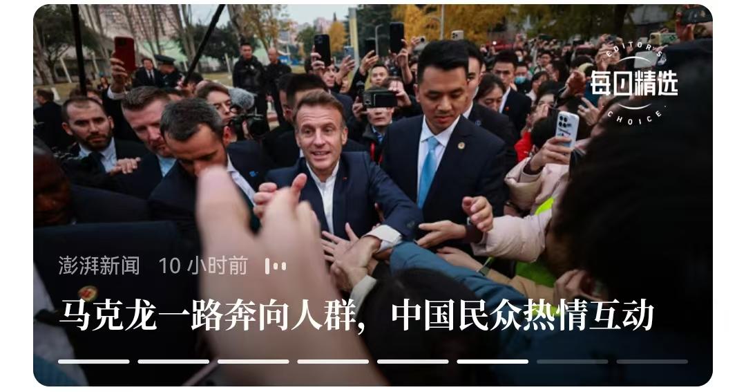 马克龙来到中国,才有胆量“跑向群众”,在法国,基本不可能的。 这不仅是治安问题,还有中国政治稳定,中国人向心力足,有足够自信,这点现在西方国家显然没有,他们可不敢走向民众,除非安排好一场戏。 现在马克龙在法国,民声可很差,估计许多人想揍他,还有人想干掉他,在中国,他没有担心,在成都居然跑向群众。 有人说什么“民主国家”的领导人“不惧怕民众”,显然是不小心说漏了“西方民主是伪民主”的事实。