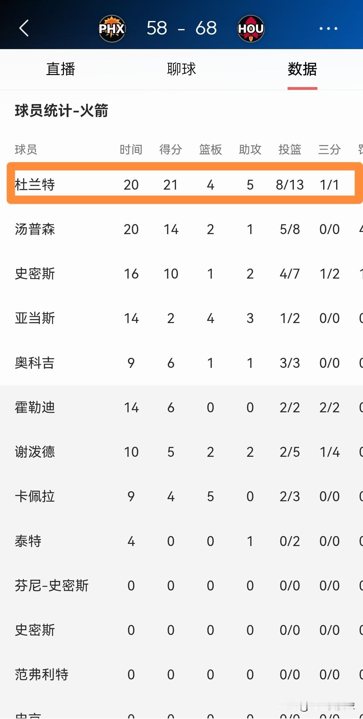 火箭超级巨星杜兰特的调整能力真是太强了!在今天火箭主场迎战太阳的上半场比赛中,杜兰特首发出战20分钟,投篮13中8,其中三分球1中1、罚球4中4爆砍21分4篮板5助攻,他的场上正负值为+14,带领球队以68:58领先对手结束了上半场的比赛。 最让人感到不可思议的是,杜兰特在第一节比赛中仅仅得到5分的情况下迅速的调整好了自己的状态,他在第二节比赛中极为高效的砍下17分,带领球队扩大了领先优势。