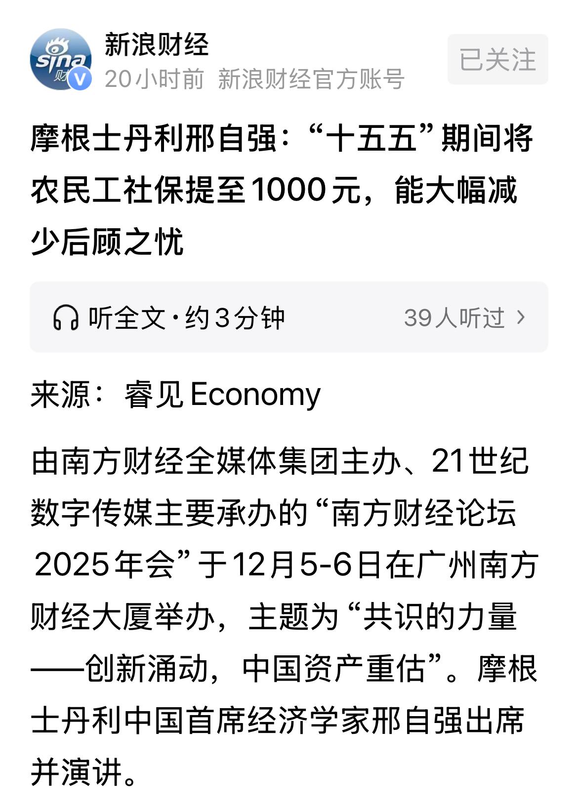 邢自强此前多次提到农民社保、农民工问题。感觉此人比绝大多数国内专家更了解中国社会经济发展的阻点以及解锁密码,而且更敢于表达。 他建议,在“十五五”期间,将农民、农民工群体的养老金从当前每月200多元逐步提升至1000元,这样能编织最低安全保障网,大幅减少其后顾之忧,释放消费潜力。 他建议,提升国有资本划转社保的比例、调整财政支出结构、推进税制调整等。 他说,中低收入群体如外出打工的灵活就业人员、农民工储蓄率平均在45%左右,比总体储蓄率还高。这是因为他们享受的社会保障程度低,养老、失业、医疗等方面缺乏保障,只能自己存钱,导致消费率偏低。 真知灼见,却又显而易见。 邢自强,摩根士丹利中国首席经济学家。