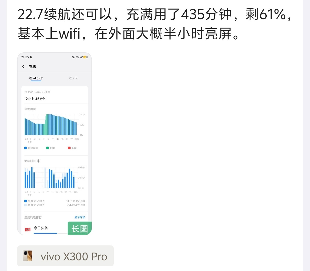 网友x300 Pro的真实使用续航,仅供参考。(版本是最新的22.7)