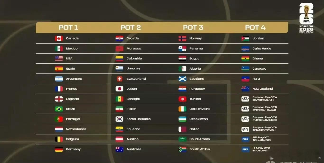 美加墨世界杯抽签,死亡之组的概率小了很多一是扩军导致晋级球队成色不足。以往最能制造冷门的三档球队变菜了。二是欧洲球队最多两支同组的回避原则。死亡之组就算有,也最可能在巴西阿根廷身上,概率降低。除非抽出巴西/日本/挪威/意大利(若出线)逆天概率签。三是东道主美加墨落位一档,且8个成绩最好的小组第三也出现,就算抽出上述说的巴/日/挪/意,感觉也没什么。美加墨世界杯