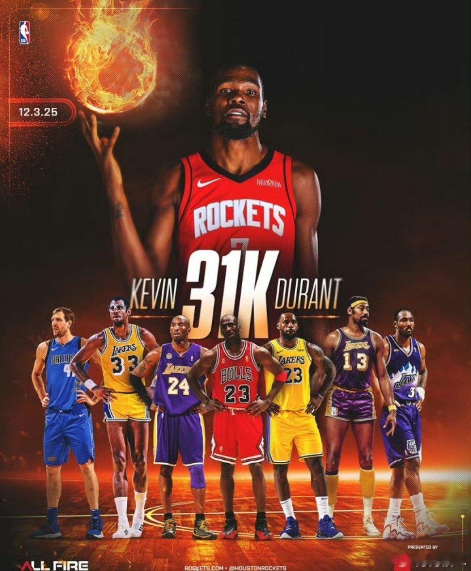 NBA 赛场再添历史性时刻!在某场比赛中,杜兰特凭借一记标志性后仰跳投拿下本场第 4 分,个人生涯总得分正式突破 31000 分大关,成为联盟历史上第 8 位达成这一成就的球员,书写属于自己的传奇篇章。这记关键得分不仅体现了杜兰特稳定的得分能力,更让他跻身 NBA 历史得分精英行列。目前 NBA 生涯得分历史前七榜单依次为:勒布朗・詹姆斯(42268 分)、贾巴尔(38387 分)、卡尔・马龙(36928 分)、科比・布莱恩特(33463 分)、迈克尔・乔丹(32292 分)、德克・诺维茨基(31560 分)、威尔逊・张伯伦(31419 分)。杜兰特的 31000 分里程碑,使其成功紧随张伯伦之后,成为现役球员中第二位(仅次于詹姆斯)迈入 “31000 分俱乐部” 的球星。作为以得分能力闻名的顶级前锋,杜兰特职业生涯历经雷霆、勇士、篮网、太阳等多支球队,始终保持高效得分表现。此次突破 31000 分,既是对他 16 年 NBA 生涯持续输出的肯定,也让外界期待他能否进一步追赶身前的诺维茨基,在历史得分榜上继续攀升。而那记奠定里程碑的后仰跳投,也成为他无数经典得分瞬间中又一值得铭记的画面。