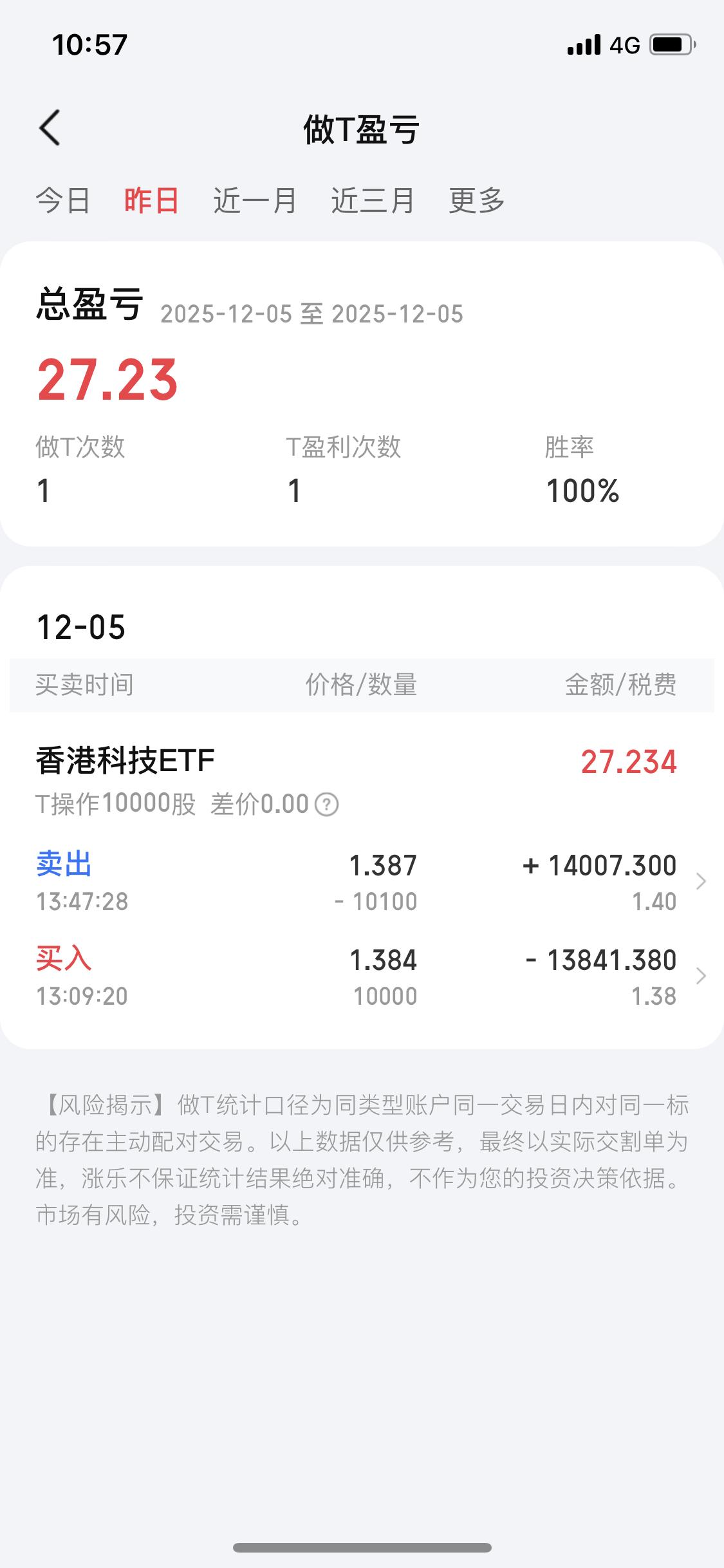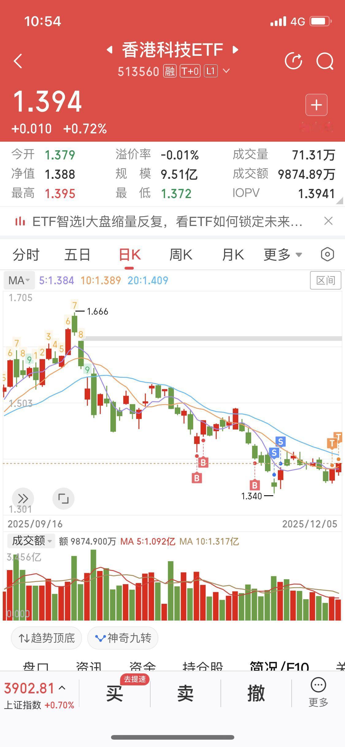 12月6日我冒出个大胆想法,没底仓做日内T,选趋势向上的ETF是个好办法。就像我操作香港科技ETF,前天买10000股、昨天买7900股,分别赚了27和45,手续费才2元左右,一个赚3厘,一个赚6厘,当天买卖落袋为安,不用操心明天的风险。 ETF适合新手,门槛低,最低几十、百元就能上车,还不怕个股暴雷,手续费也低,场内交易免印花税,佣金最低万0.85。操作时,挑管理费低的买能省不少钱,也别把钱全投一个领域。我这几天的小赚,让我更坚定了这种操作方式,数量够多,一天赚几百真不是梦。