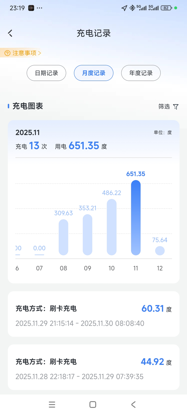 11月用车总结 蔚来ES611月共计行驶3244公里,我自己有家充桩,上一台电车就用的,刚好这次买蔚来有充放电套装选购,就选了,所以以前的交流充电桩也可以给蔚来ES6充电了 共计使用了571.5度电,充电桩实际充了651.35度,那是因为另外一台电车也还在用,不过使用比较少了,所以蔚来统计的度数和实际充电度数应该是一致的。 我基本都是晚上十点开始充电,电费大概是0.33元一度电 571.5*0.33=188.595元 189元/3244公里=0.058元/公里 是不是非常省啊!还没怎么跑过长途,合肥市内最高峰跑过410公里续航还剩35,其他时候基本都是270左右,剩下170左右我就开始充电,因为续航低于100后,我的7KW充电桩一晚上充不满