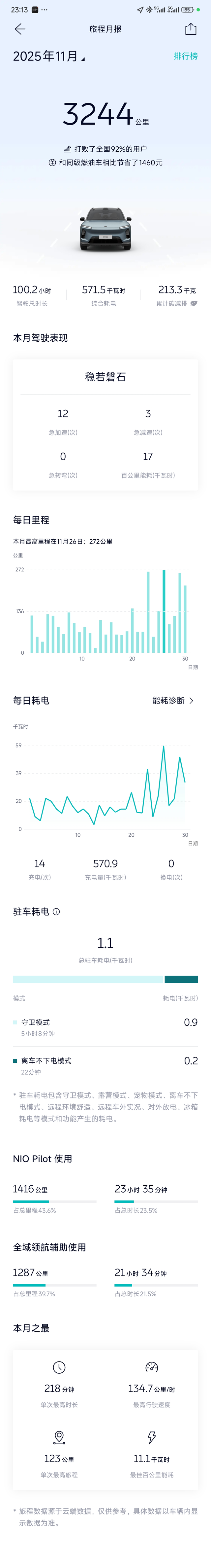 11月用车总结 蔚来ES611月共计行驶3244公里,我自己有家充桩,上一台电车