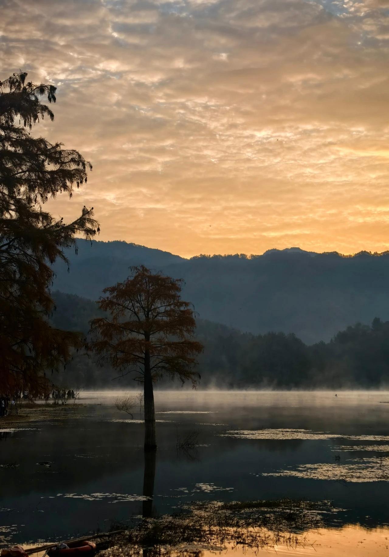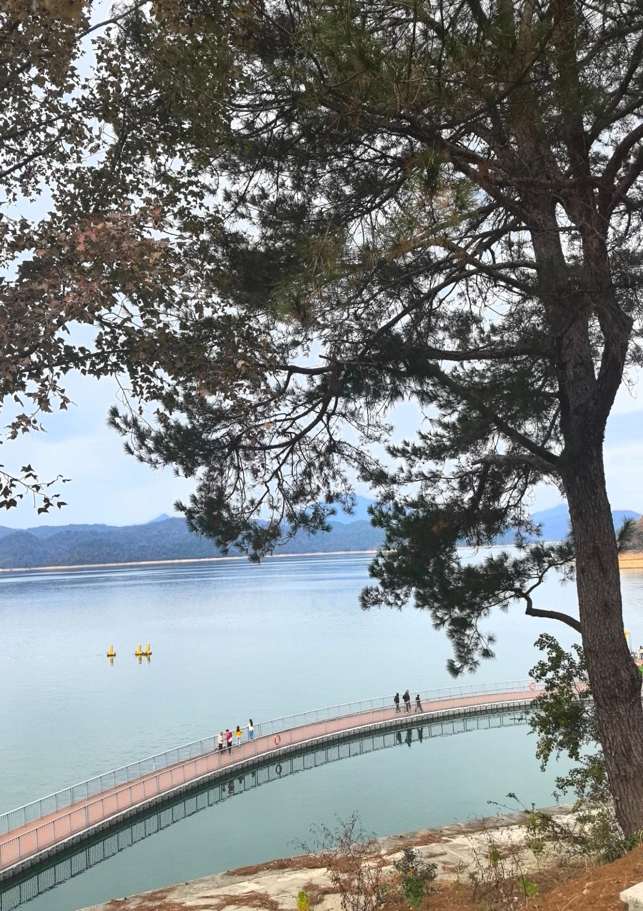 奇墅湖晨雾+卢村+太平湖+桃花潭 一早六点起床去宏村西门停车看奇墅湖晨雾,很壮观,第一次见,水墨江南。 看完后去地图上的奇墅湖看了一眼,也不错,山坡上俯视朝阳下湖水边的古村落别有风味。 看完回酒店吃早饭,然后发车前往太平湖观景,走走停停一路玩回家,太平湖看完去桃花潭,依然是小众宝藏景点桃花潭西岸,喝了咖啡远眺桃花潭,很不错,出来看到乐仙女布偶。 徽州自由行 徽州微旅游