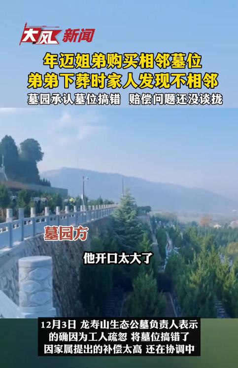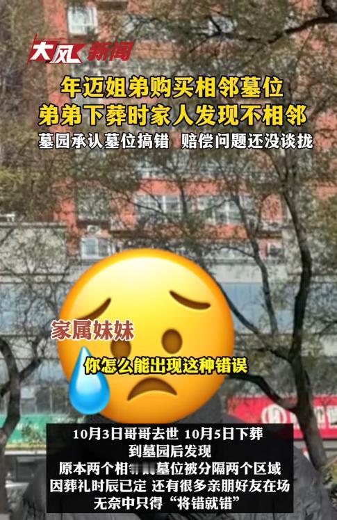 “离了个大谱!”2025年7月,陕西渭南,一老人因突患重病,身体状况不容乐观,家人商量后事后,觉得老人姐姐年纪也很大了,就购买了2个相邻的墓位。可等到老人下葬时,家属却发现墓位不相邻!墓园方:对方索赔1.5万,无法接受。 生老病死,这是每个人都要经历的事情,很多地方对于后事非常讲究,往往会提前规划,只是张女士没想到,原本这么严肃的事情,工作人员竟然会犯最低级的错误! 7月份时,张女士的哥哥生了一场大病,情况不容乐观,于是家人就开始商量老人的后事了,同时在考虑到姐姐的年纪也大了后,就准备购置一处相邻的墓位,让二人“团聚”。 就这样,张家人花了7万多,在当地一处墓园购买了2个相邻的墓位。 到了10月份,张女士的哥哥去世,家人在办完丧事后就前往了墓园,可是工作人员却将他们带到了错误的地方,由于已经到了下葬的时间,家人没时间再转移,于是只能在这里埋葬了老人。 事后,张女士找到工作人员,要求赔偿1.5万元,可是园方只愿赔偿6000元,由于双方的差距较大,所以一直都没有谈拢。 网友看后表示,这样的工作态度真是令人怀疑,如此低级的错误怎么会犯呢?工作人员难道没有接受培训就上上岗了,真是太缺德了! 信息来源:《年迈姐弟购买相邻墓位,弟弟下葬时家人发现不相邻,墓园承认搞错》鲁网