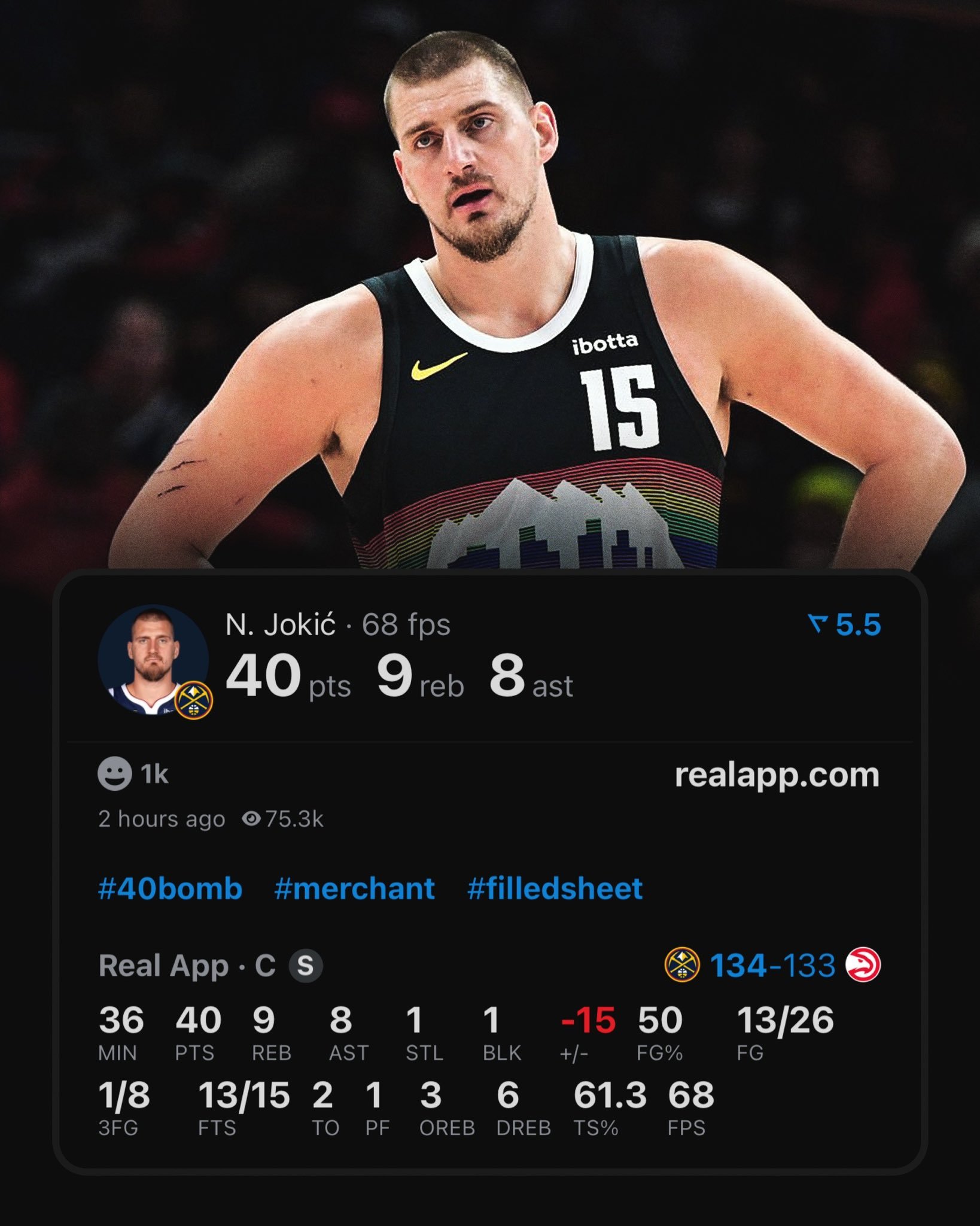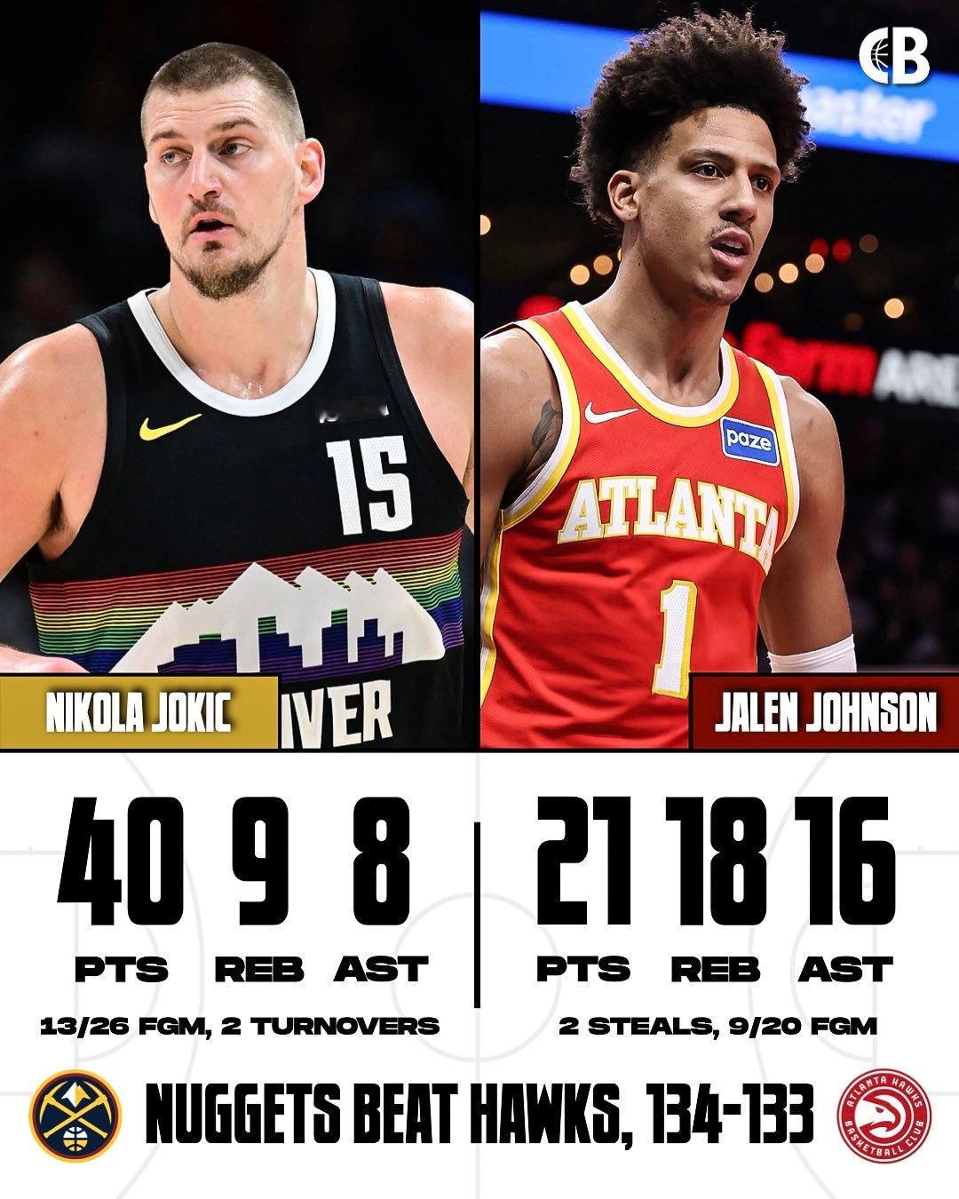 什么水平??今天的约基奇:——投篮26中13,三分8中1,罚球15中13——拿下40分9篮板8助攻,正负值-15——上半场只得10分,掘金最多落后23分——下半场拿了30分,其中第三节单节19分掘金这都能追回来,约基奇罕见赢球的比赛里居然正负值-15,不一样了啊!掘金vs老鹰