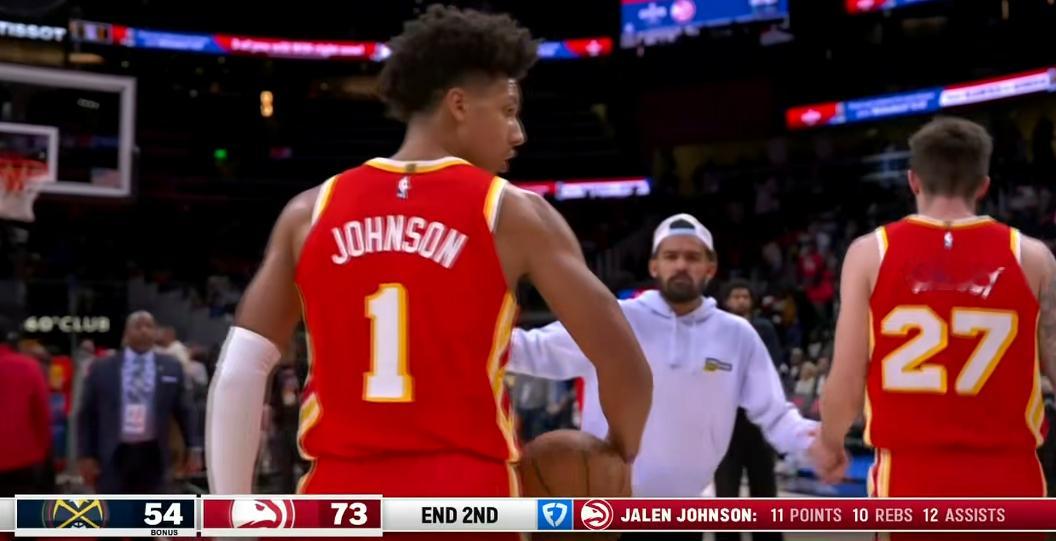 老鹰半场六人得分上双,没错,是半场。杰伦-约翰逊半场11分10篮板12助攻,一节半就拿到了三双。半场结束时的这个镜头,像是鹰王完成了权力交接。