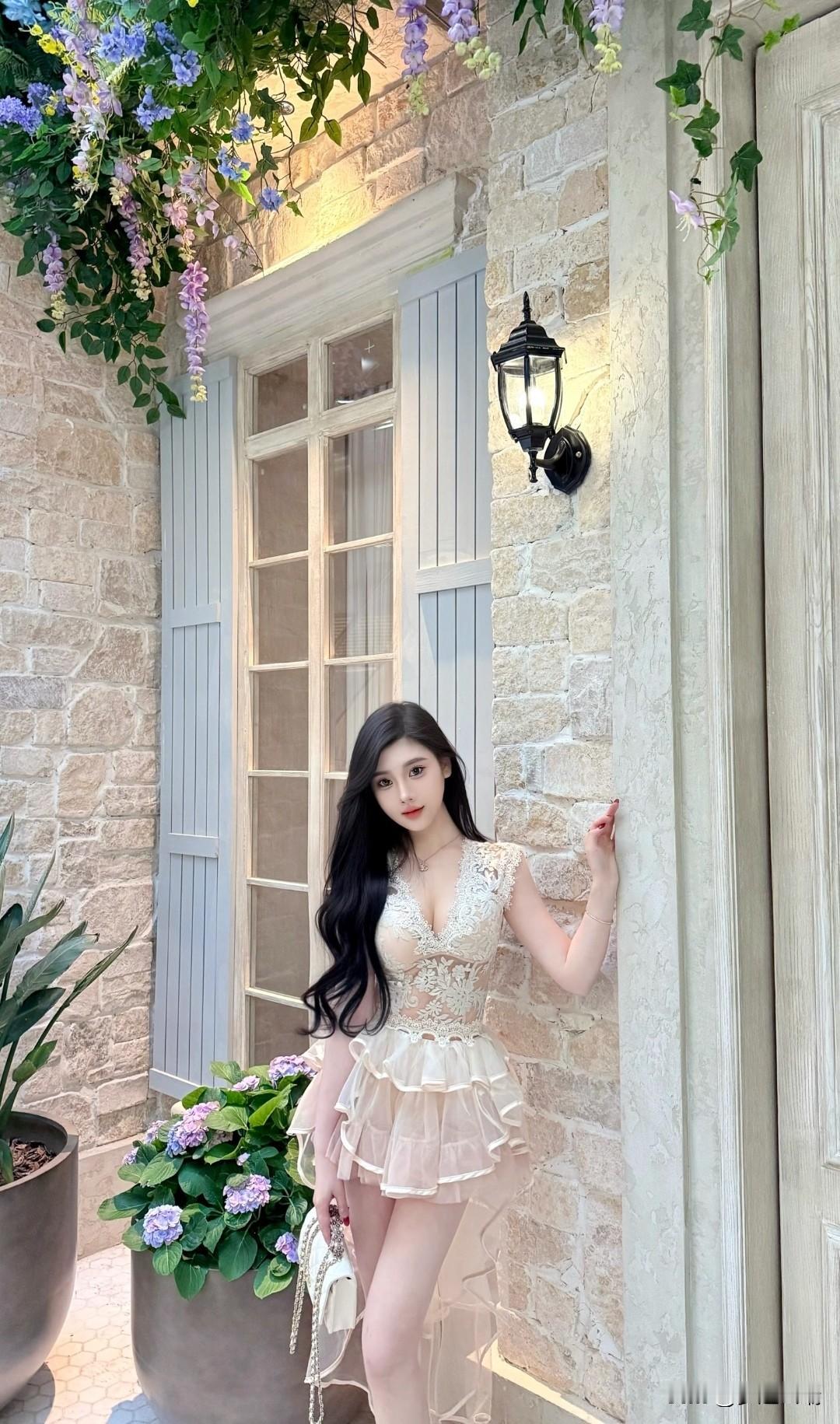 优雅白裙搭配米色针织开衫,石墙前的一抹清新。