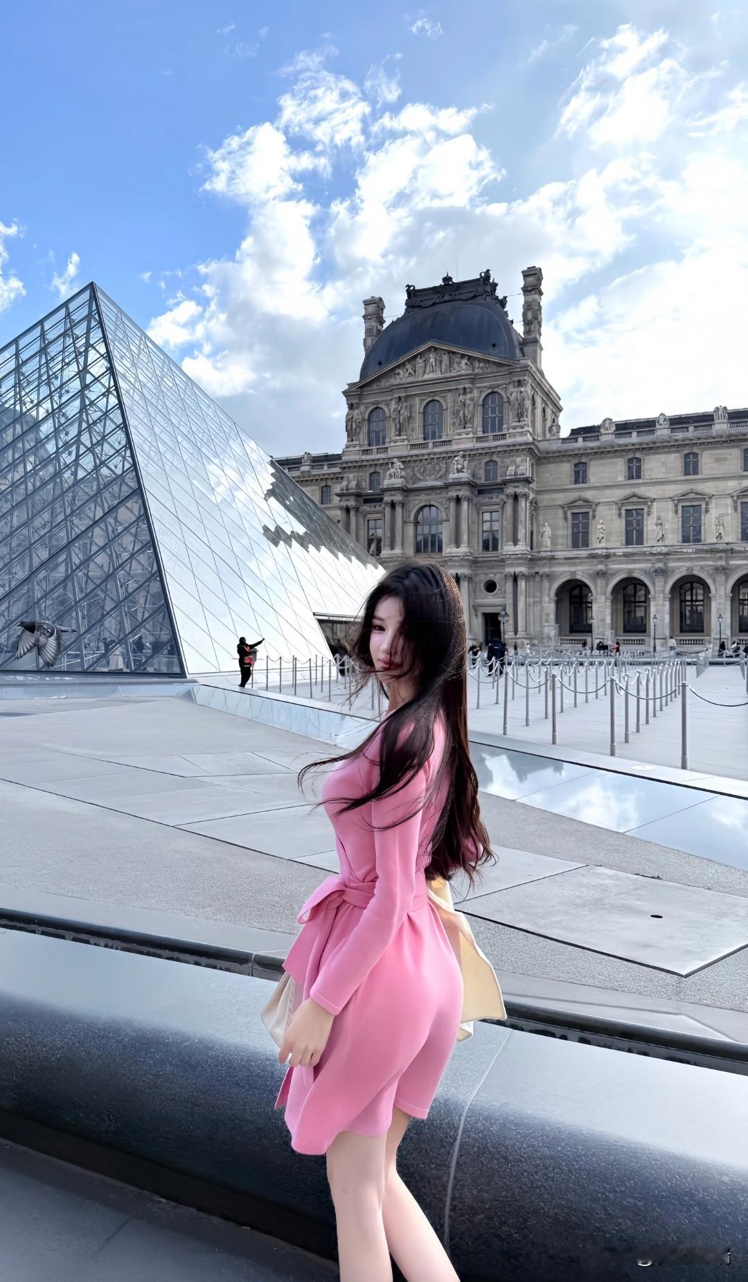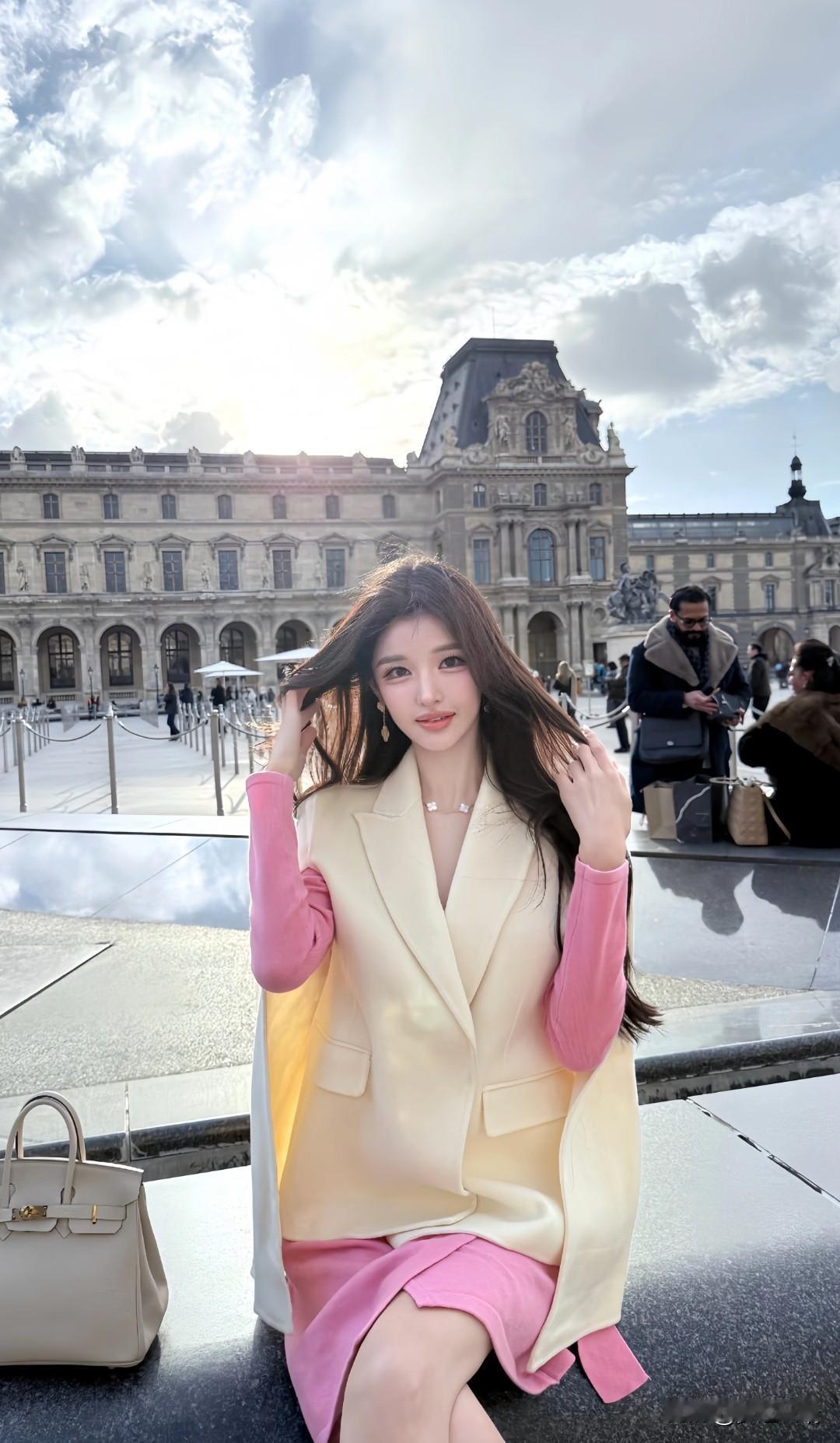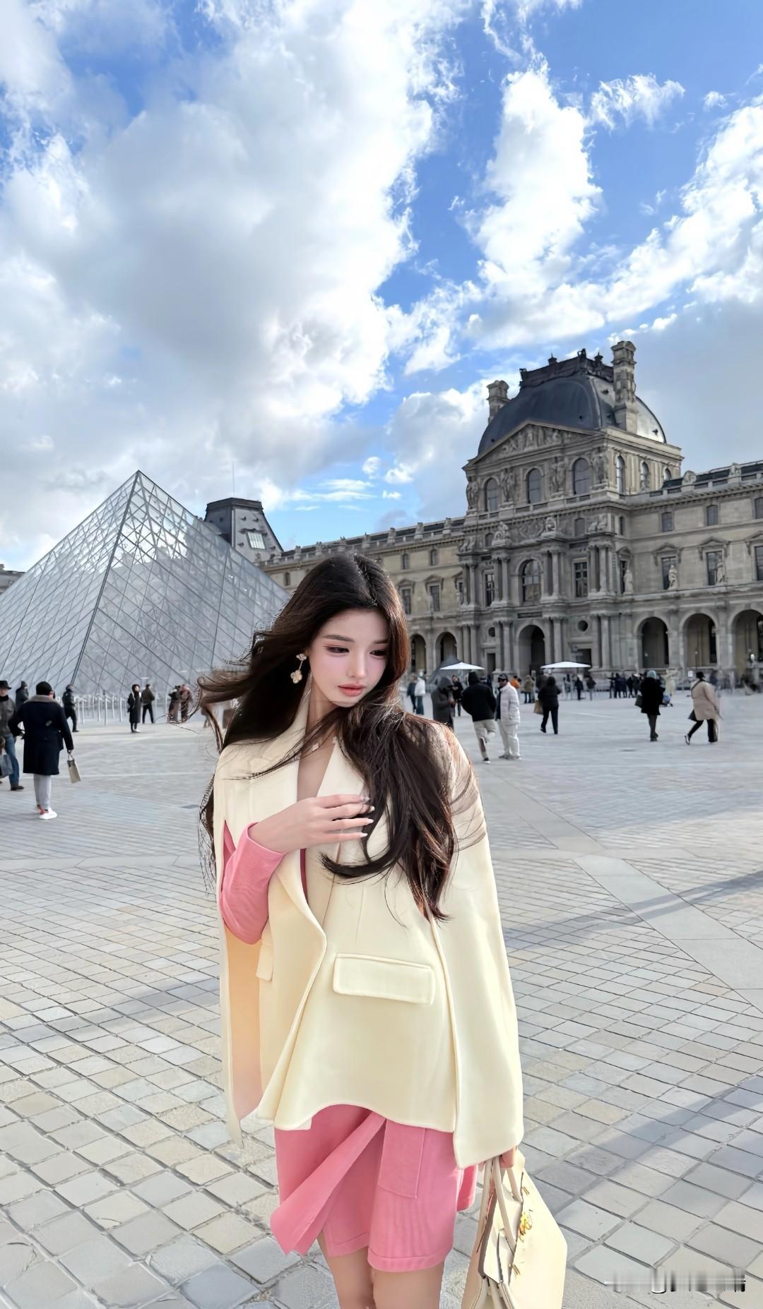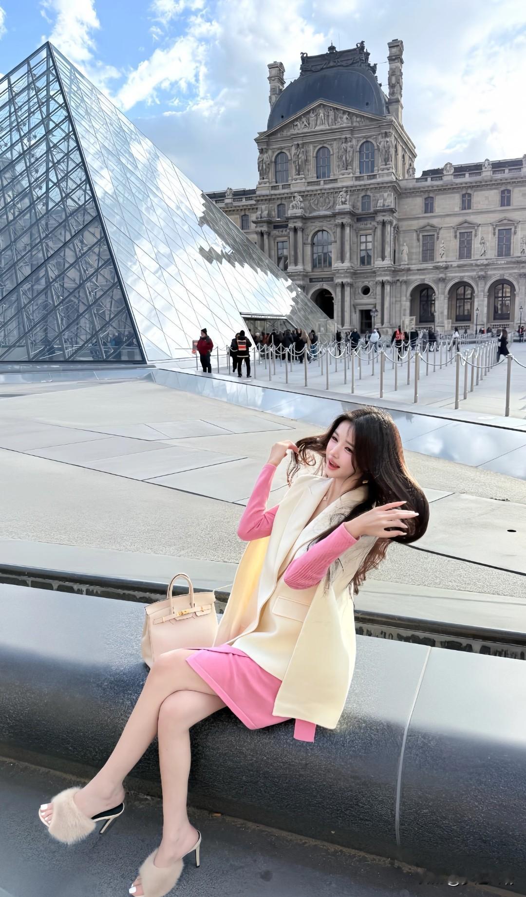 在卢浮宫前的浪漫时刻,粉白相间的穿搭与背景的古典建筑相得益彰。