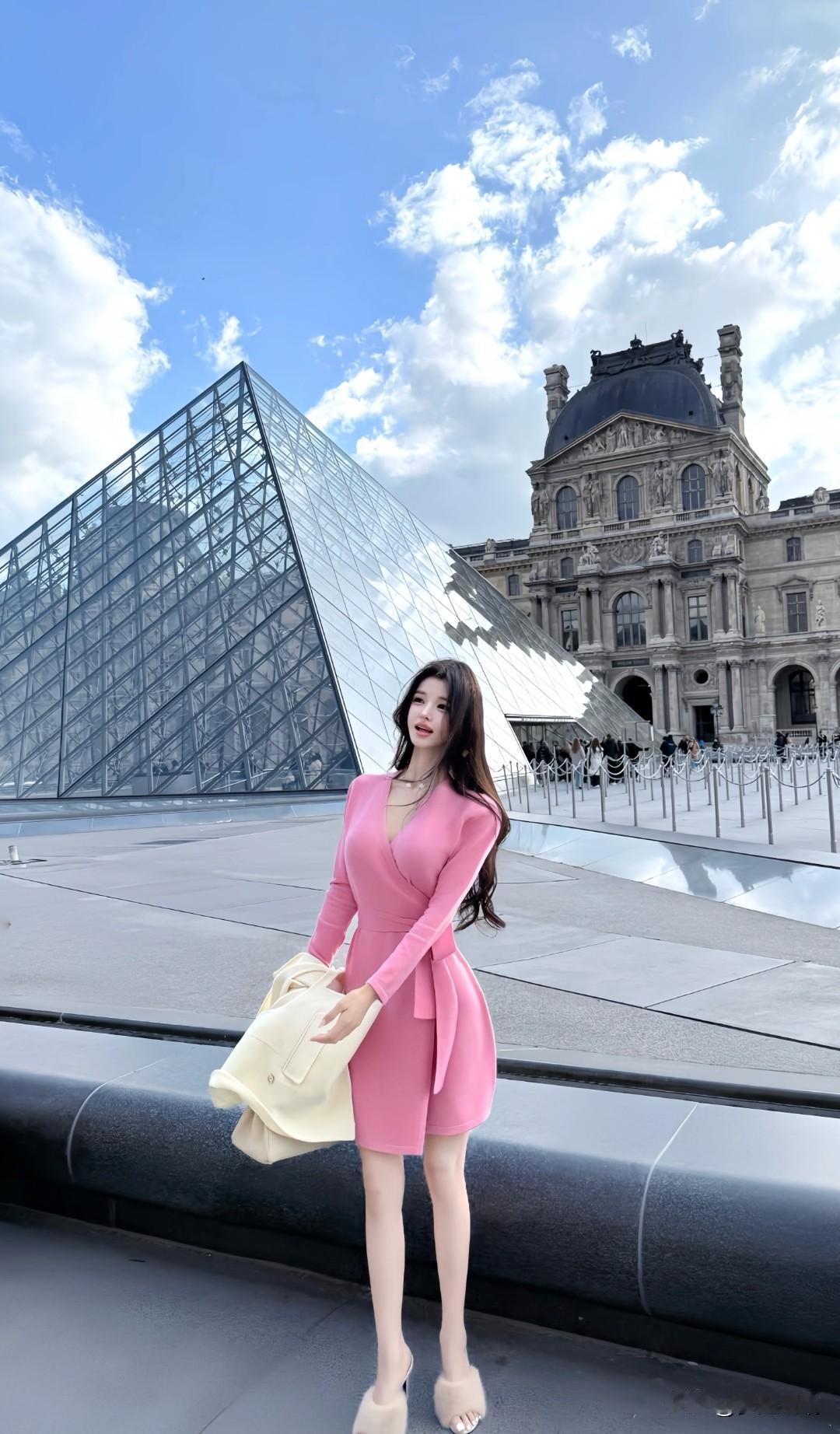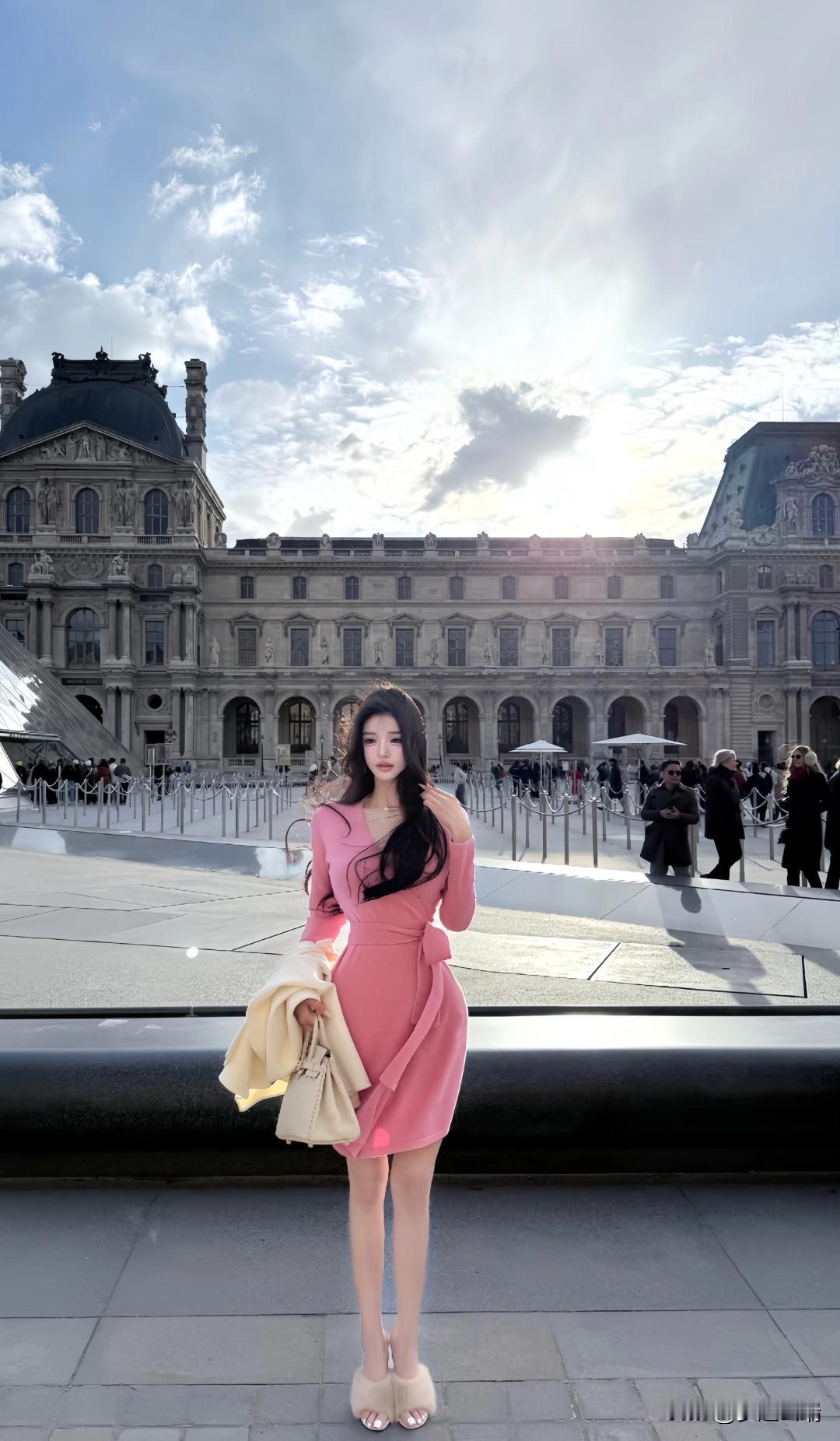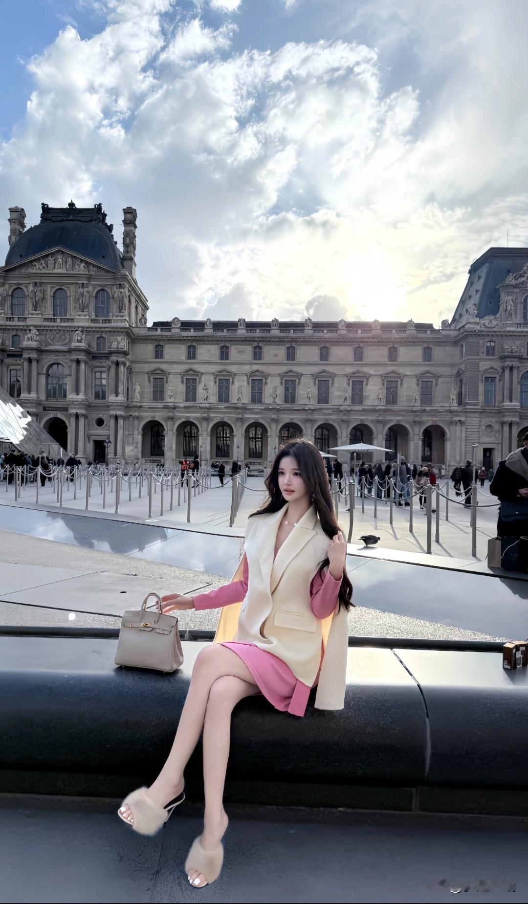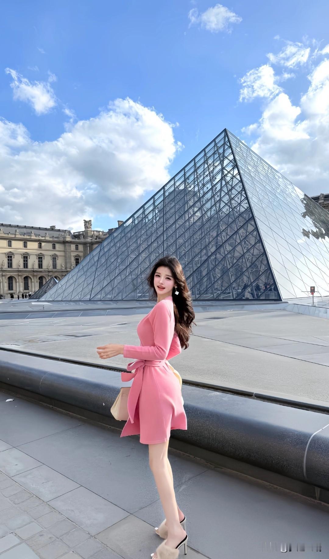 在卢浮宫前的浪漫时刻,粉白相间的穿搭与背景的古典建筑相得益彰。