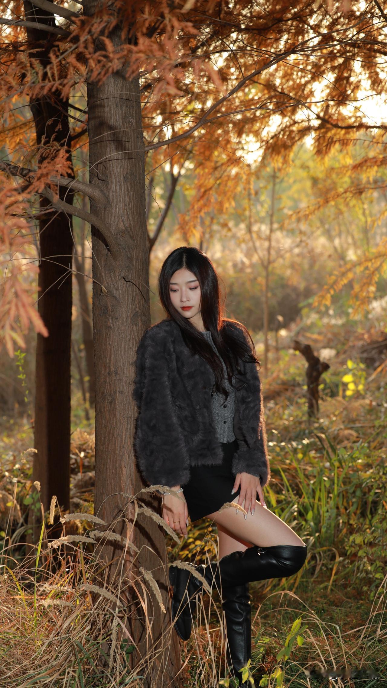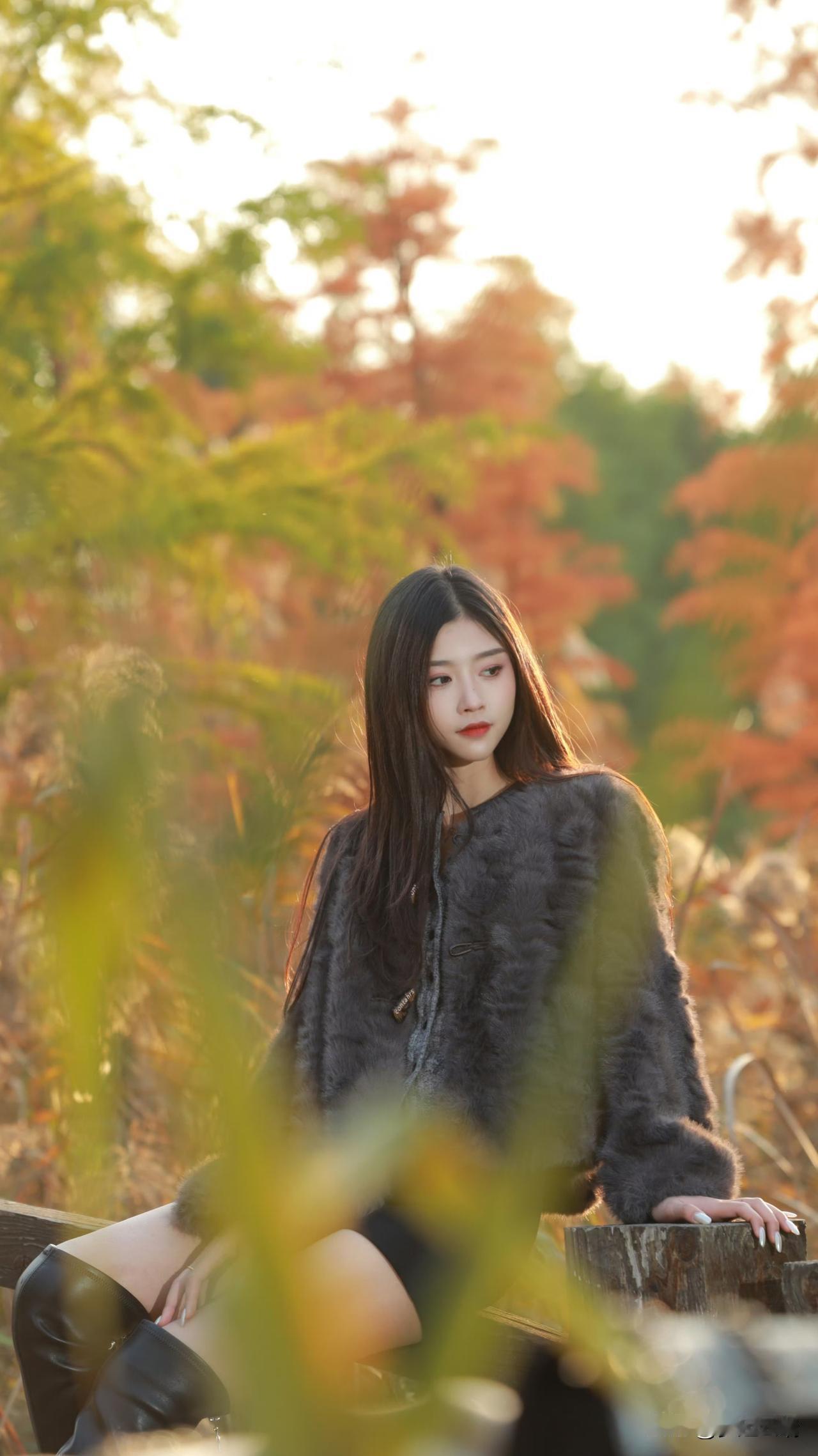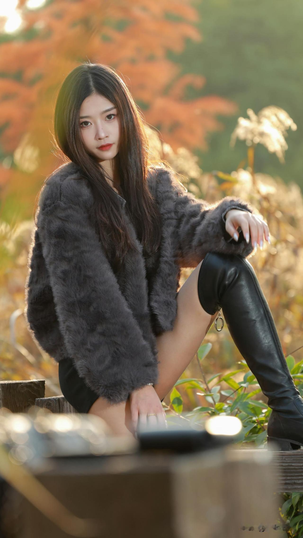 秋日暖阳下的少女,黑发红唇,清新动人。