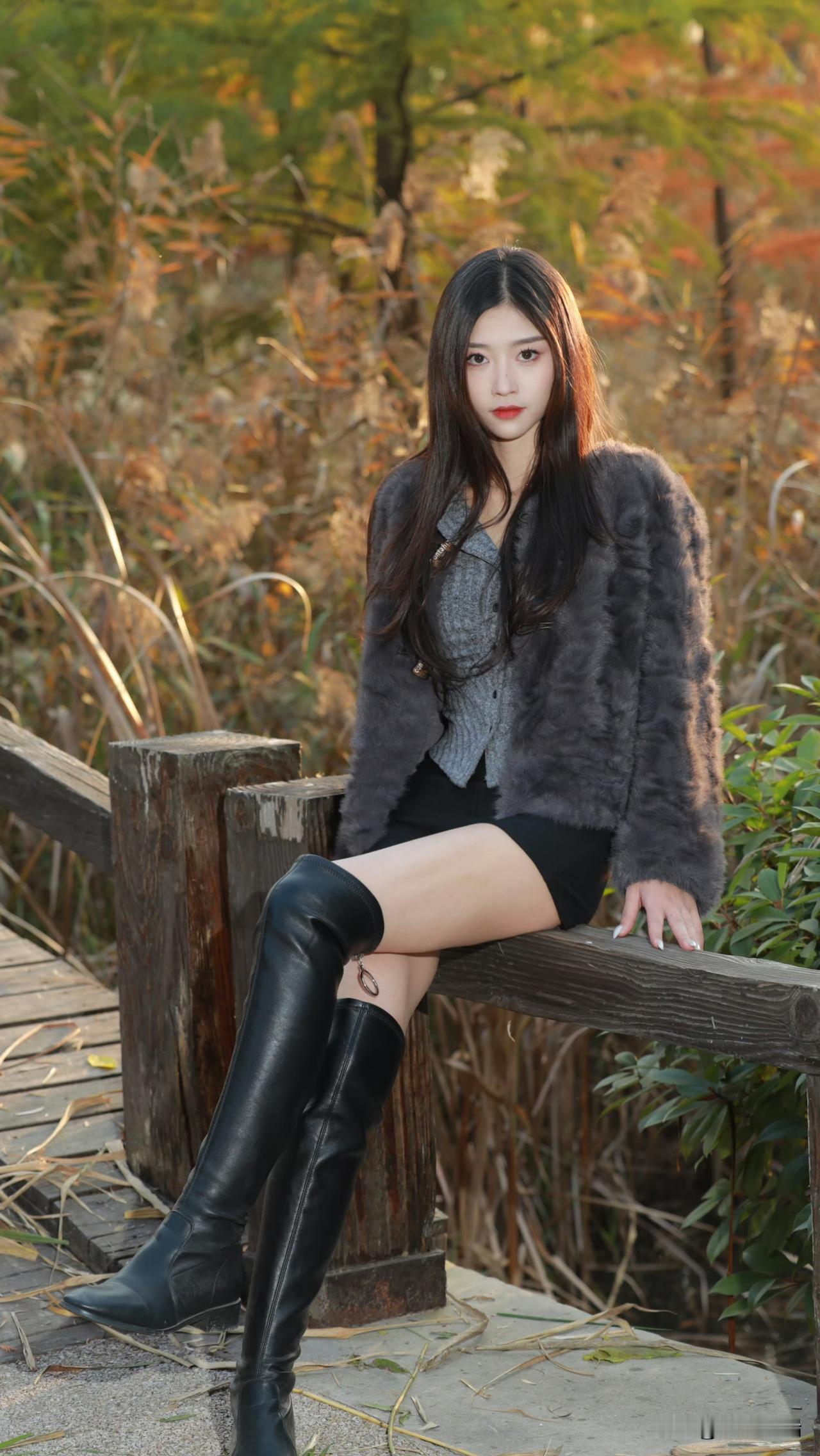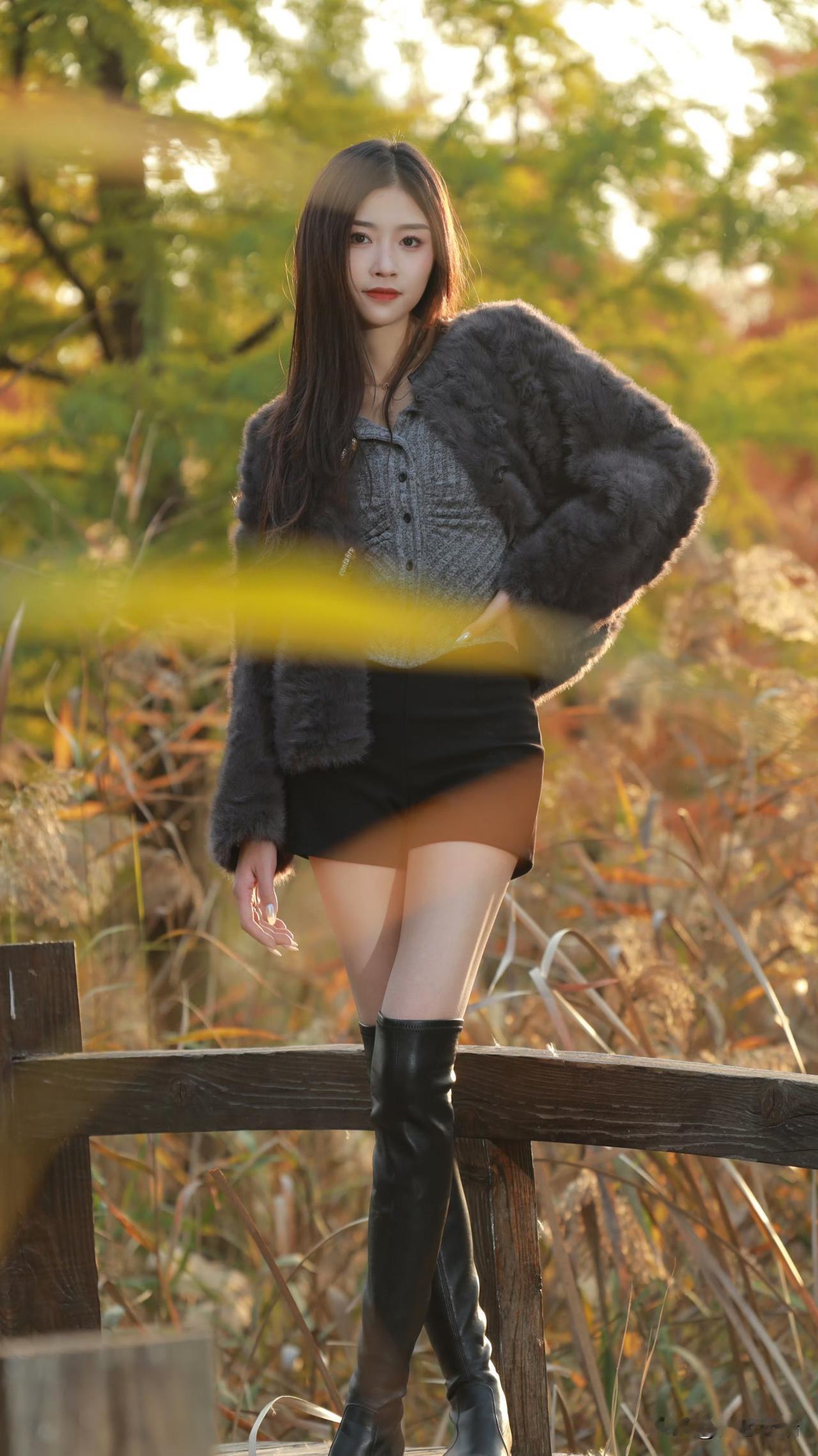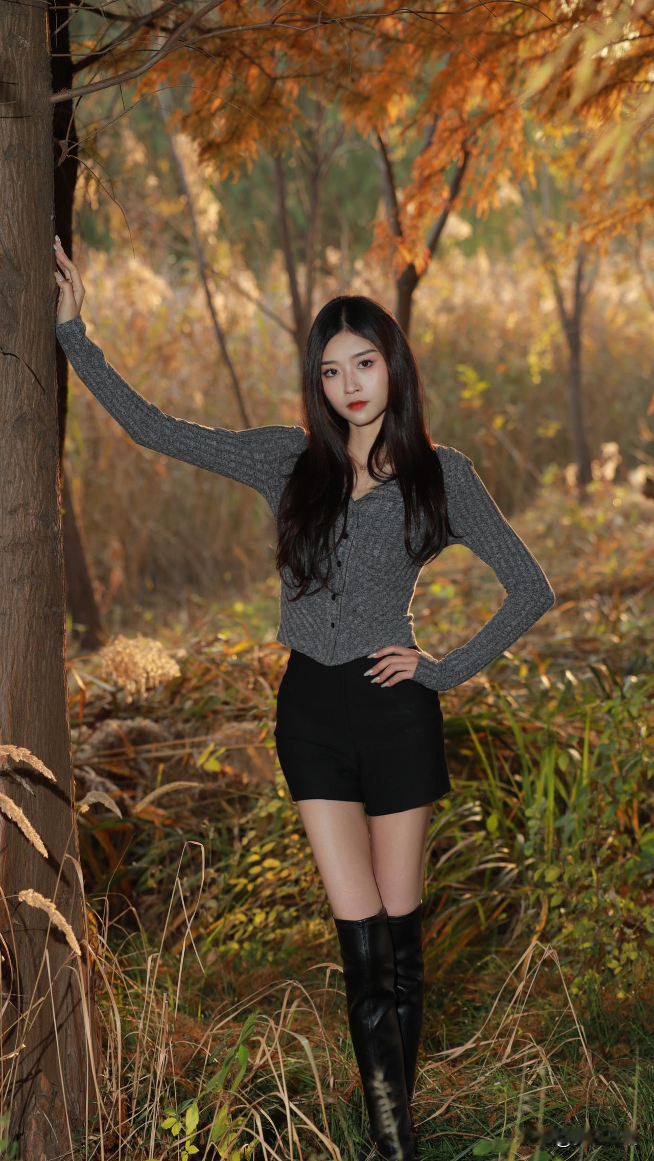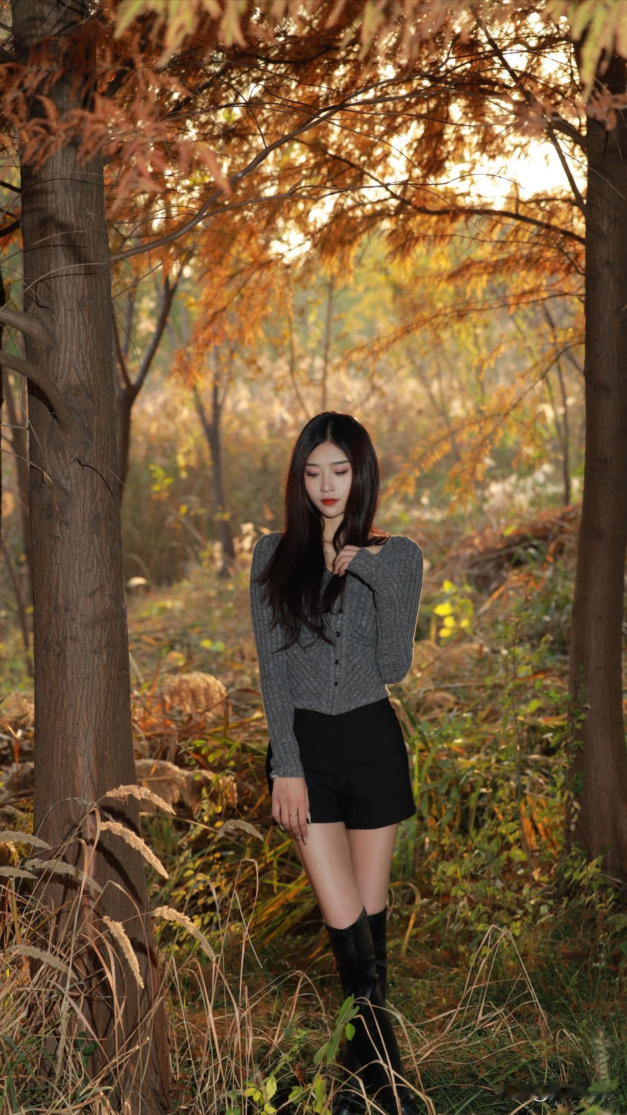 秋日暖阳下的少女,黑发红唇,清新动人。