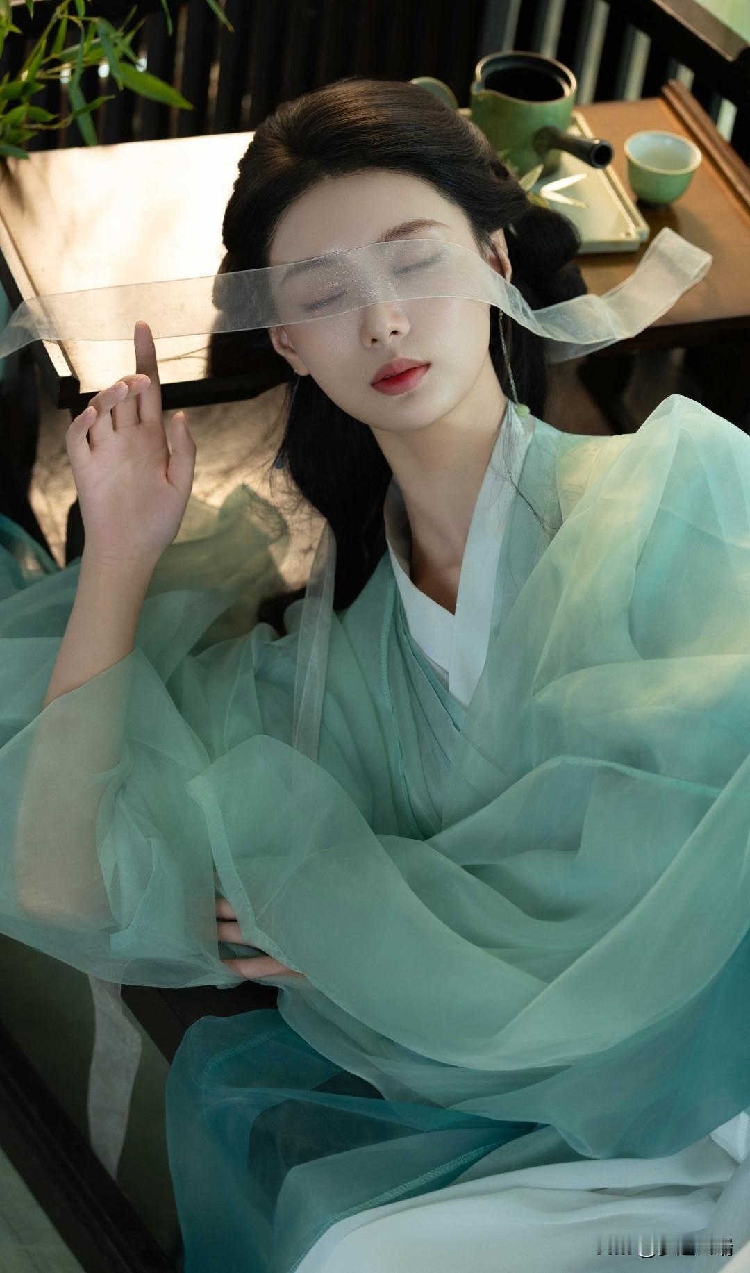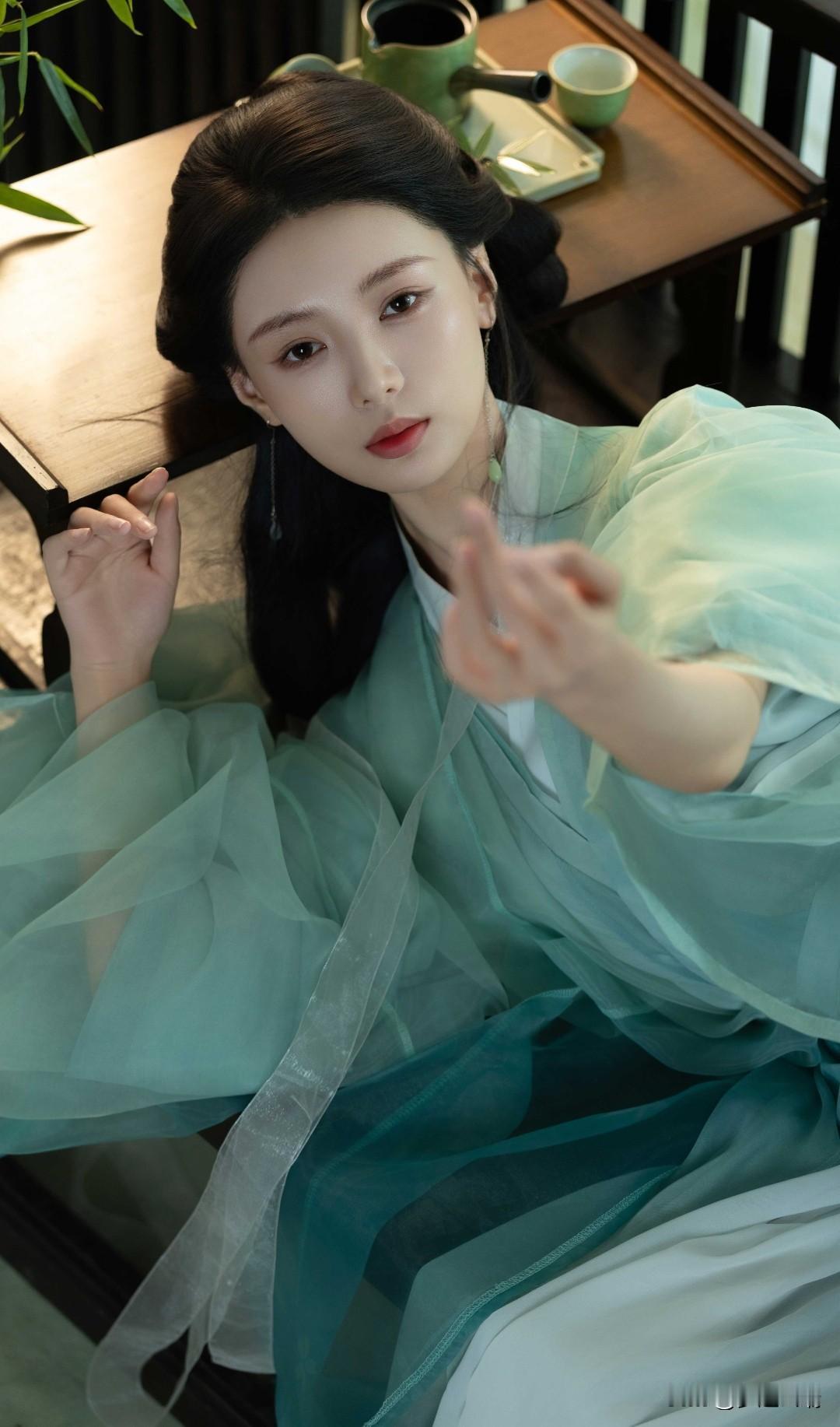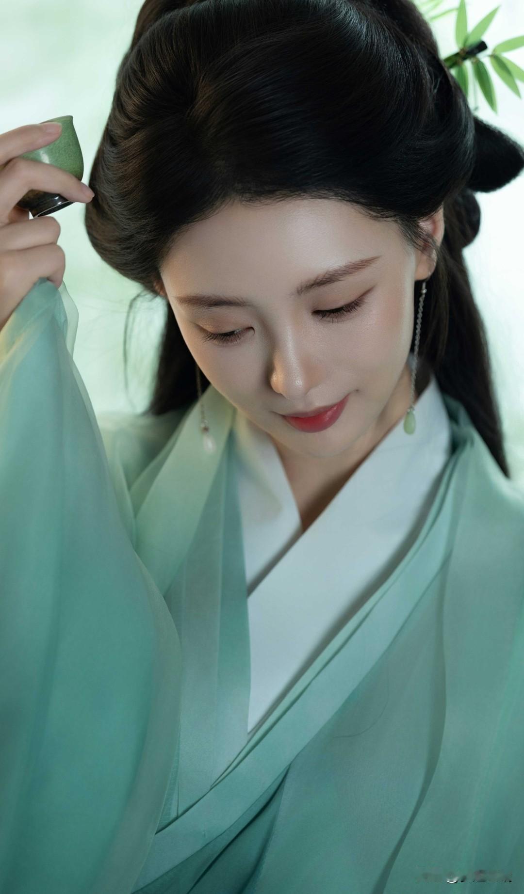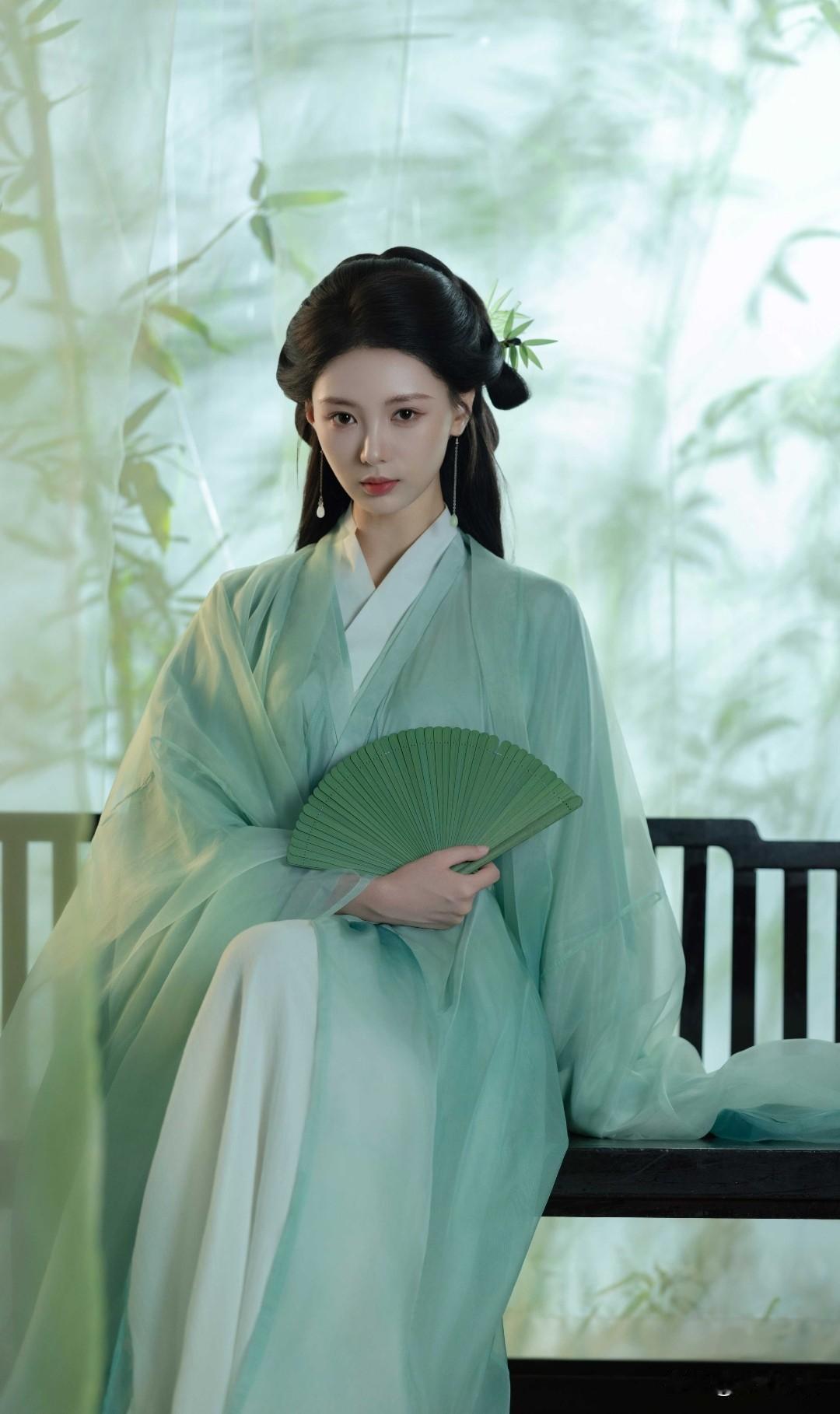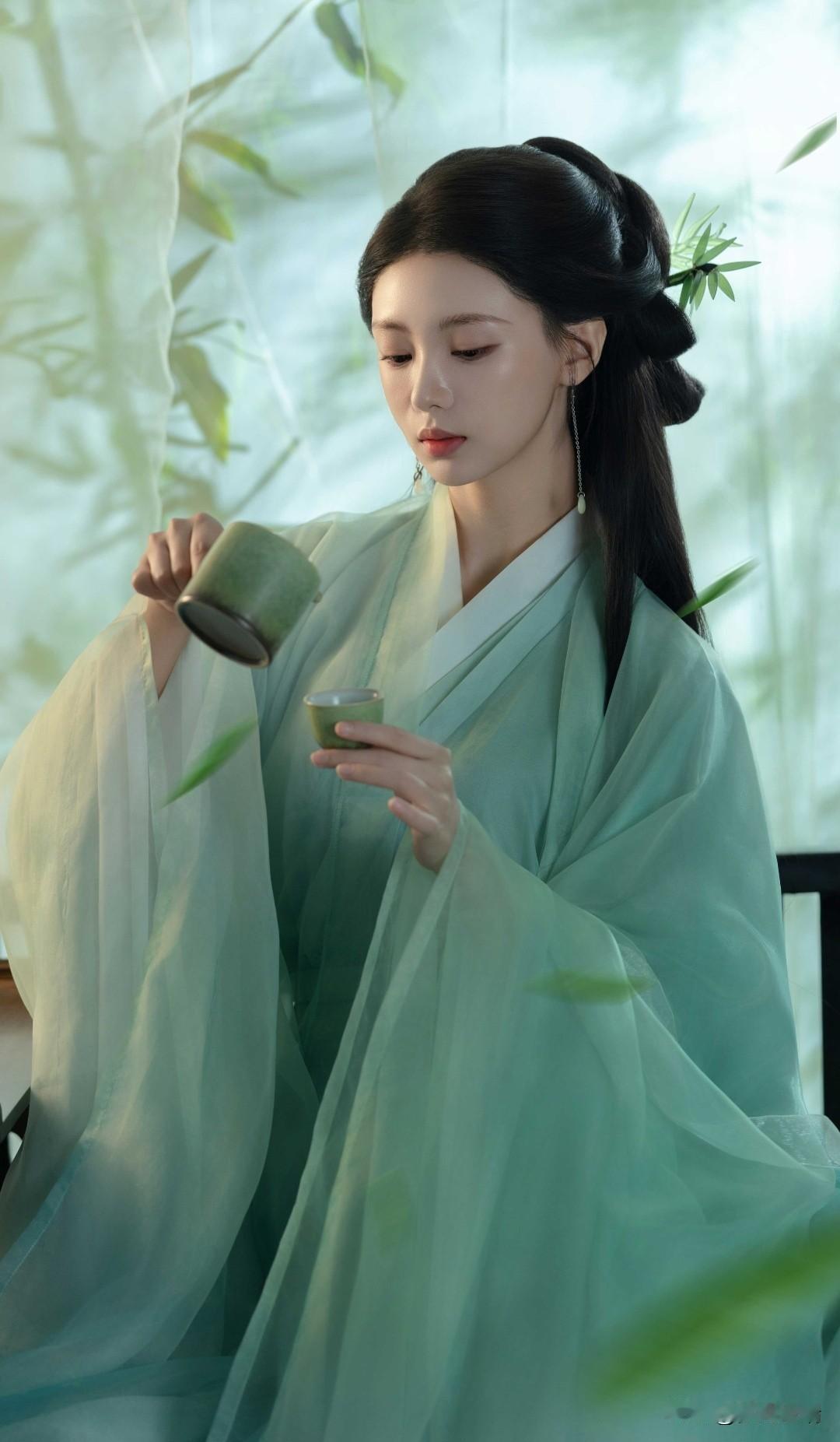 古典美人,绿衣飘飘,竹影婆娑,静谧如画。