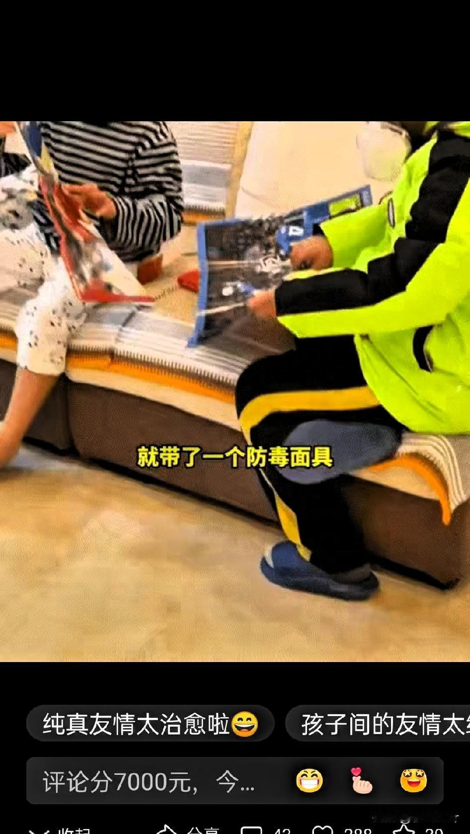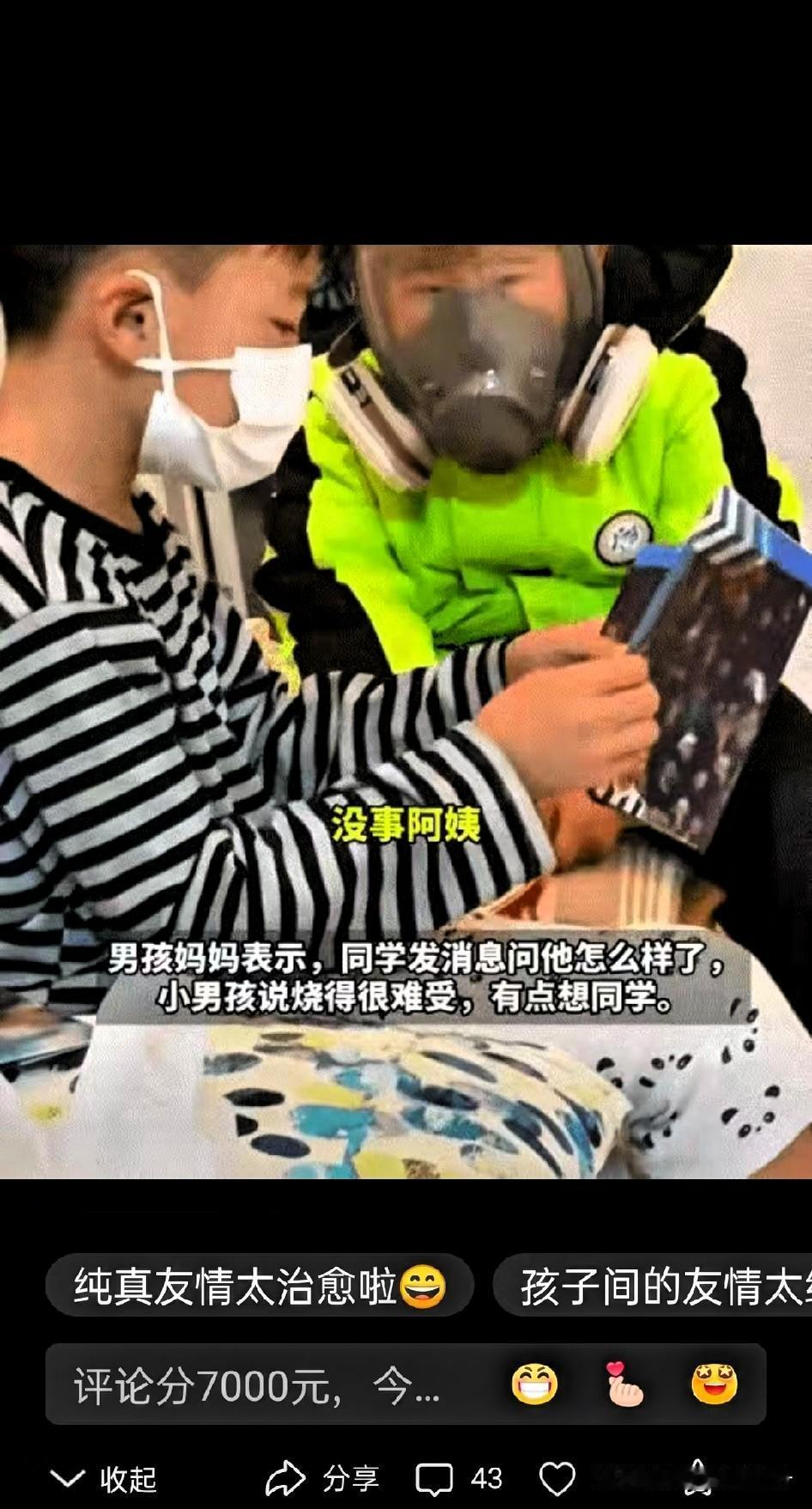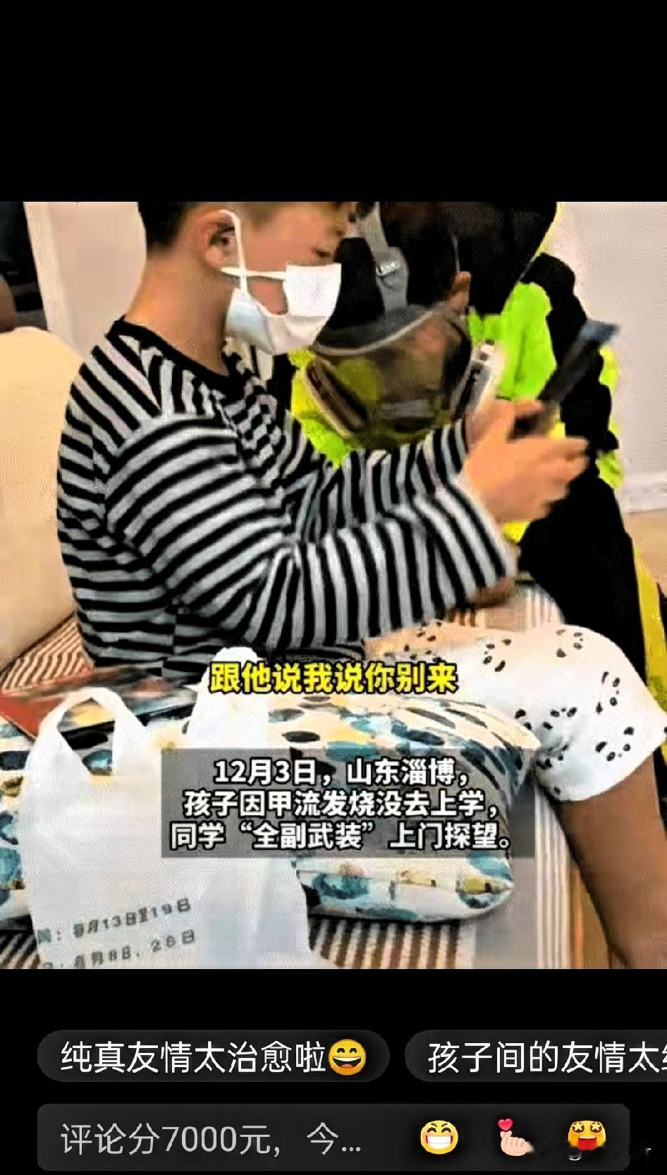 万万没想到!山东,一小男孩因为流感发烧没去上学,在家休养时,打电话和同学说自己烧的难受 还有点想念他,男孩听完后,当即就想上门探望,同学妈妈担心会交叉传染,连忙在电话里劝阻,可男孩却认真回应:“阿姨,我戴好面具就没事了。” 等同学妈妈出门接人时,果然看到男孩戴着严实的防毒面具,手里还细心地拎着退烧药、新鲜水果,以及一本同学平时很喜欢的课外书。 生病的男孩看到好友到来,瞬间精神了不少,笑着说感觉病都好一半了,随后便拉着对方坐到沙发上,开心地聊天玩耍。 据男孩妈妈透露,两个孩子是同班同学,平时经常一起打球,彼此感情一直很要好,看着男孩捂得严严实实的模样,她心里既觉得好笑,又满是感动。 此事传开后,不少网友调侃这是“过命的交情”,防护做到位了,情谊也没落下。在我看来,这副防毒面具不仅是物理防护,更藏着成年人逐渐缺失的交友本心。 成年人的交往总绕不开利弊权衡,顾虑麻烦、计较得失,连表达关心都要反复斟酌,可孩子的世界很简单,一句“我想你”,就能驱动他们克服顾虑去奔赴。 更难得的是男孩家长的态度,没有用“怕传染”的理由打消孩子的善意,而是用防毒面具平衡了关怀与健康,既守护了孩子的真心,也传递了恰当的分寸。 友情最珍贵的从来不是轰轰烈烈,而是这种有顾虑却依然愿意靠近的真诚,孩子的这份纯粹,恰恰是友情最本真的模样。