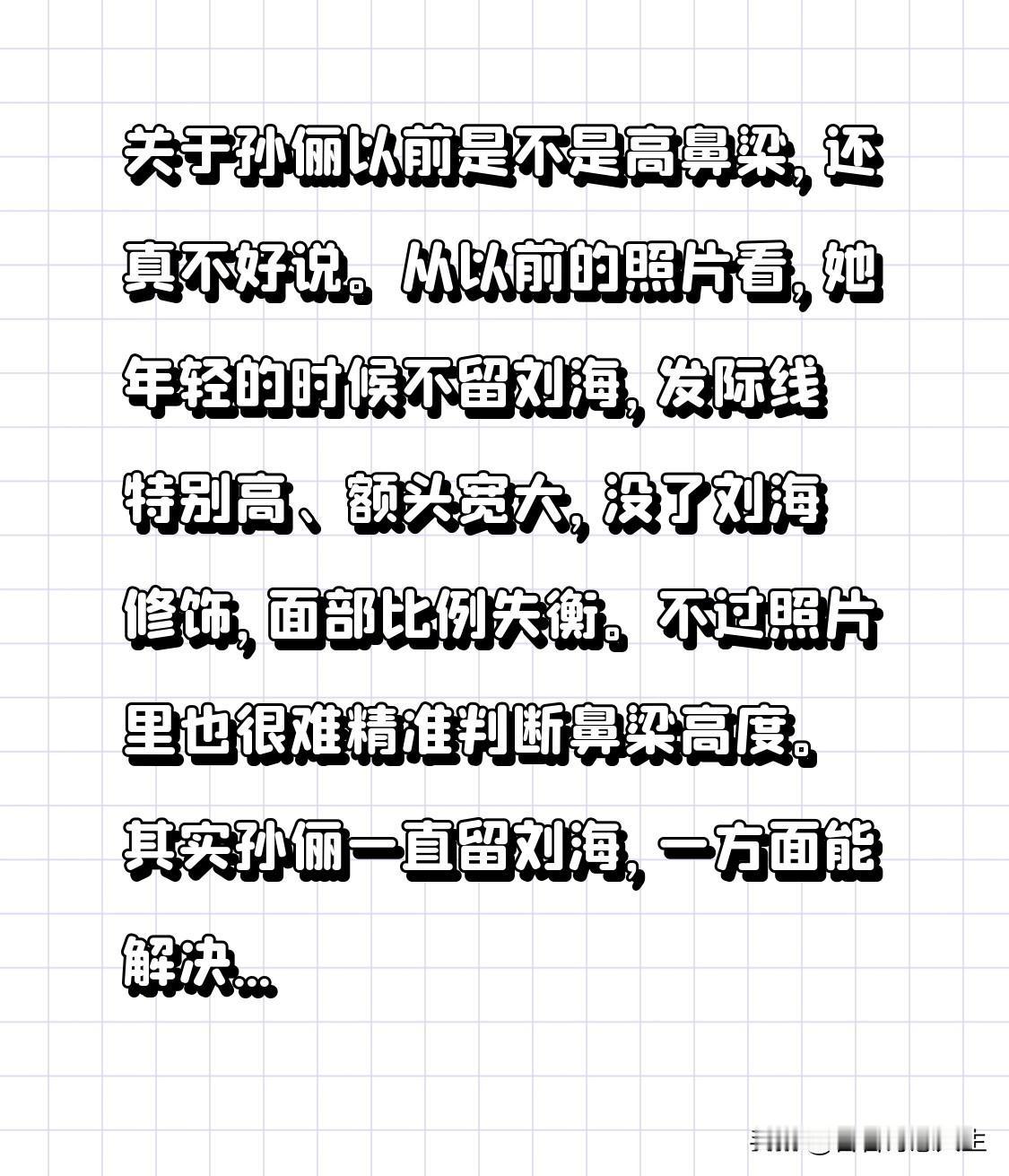 关于孙俪以前是不是高鼻梁,还真不好说。从以前的照片看,她年轻的时候不留刘海,发际线特别高、额头宽大,没了刘海修饰,面部比例失衡。不过照片里也很难精准判断鼻梁高度。 其实孙俪一直留刘海,一方面能解决眼睛问题,她眼睛大且有些突出,没刘海时额头留白多,眼部更突出、人没精神,有了刘海视线集中到五官,眼睛更有神;另一方面能修饰额头和发际线,缩短额头视觉长度,让面部比例更协调。也许鼻梁的视觉效果也会受这些因素影响,不好单看以前照片判断是不是高鼻梁啦。 🌹🌹🌹🌹🌹🌹🌹🌹🌹嘿嘿🤤🤤🤤