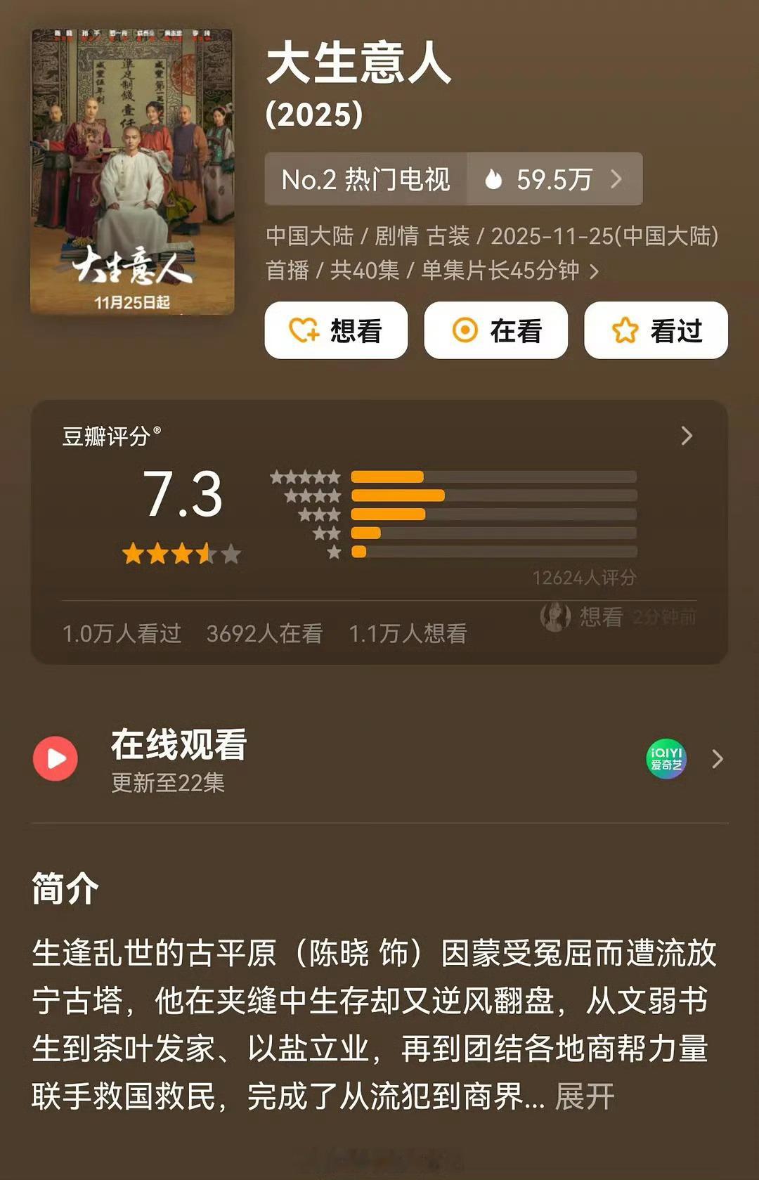 陈晓大生意人持续登顶 口碑开始发酵了!大生意人豆瓣开分7.3,我觉得还是被一些演技不佳的年轻演员们连累了,不然绝对8分以上。