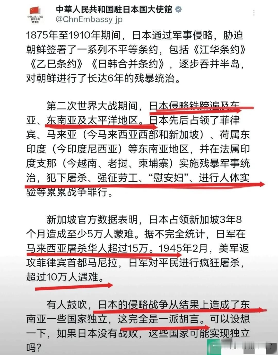 这个招式好!中国驻日本大使馆今天(1日本大使馆今天(12月5日)发文写道:“1875年至1910年期间,日本通过军事侵略,胁迫朝鲜签署了一系列不平等条约,包括《江华条约》、《乙巳条约》、《日韩合并条约》,逐步吞并半岛,对鲜进行了长达6年的残暴统治。 第二次世界大战期间,日本侵略铁蹄遍及车亚、东南亚及太平洋地区。日本先后占领了菲律宾、马来亚(今马来西亚西部和新加坡)、荷属东印度(今印度尼西亚)等东南亚地区,并在法属印度(今越南、老挝、柬埔寨)实施残暴军事统治,犯下屠杀、强征劳工、‘慰安妇’、进行人体实验等累累战争罪行。 新加坡官方数据表明,日本占领新加坡3年8个月造成至少5万人蒙难。据不完全统计,日军在马来西亚屠杀华人超过15万。1945年2月,美军返攻菲律宾首都马尼拉,日军对平民进行疯狂屠杀,超过10万人遇难。 中国驻日大使馆这波发声,简直是精准戳中要害!不是空泛的谴责,而是带着实打实的史料摆事实,每一句话都砸在日本右翼试图掩盖历史的痛点上。这么多年来,日本总有部分势力揣着明白装糊涂,要么淡化侵略罪行,要么干脆篡改历史叙事,这次算是被狠狠撕下了虚伪的面具。 可能有人会留意到,文中提及日本对朝鲜半岛的残暴统治长达6年,这其实聚焦的是二战期间的直接殖民管控阶段。若从1875年日本军舰闯入江华湾算起,它对朝鲜半岛的蚕食与压迫,前后跨度足足三十五年。《江华条约》看似是“通商协定”,实则是日本用坚船利炮逼出来的不平等枷锁,直接打破朝鲜闭关局面,为后续吞并铺路。 1905年的《乙巳条约》更是嚣张至极,直接剥夺朝鲜的外交主权,将其变为自己的“保护国”;1910年《日韩合并条约》一签,朝鲜半岛彻底沦为日本殖民地,当地百姓从此陷入被掠夺、被压迫的苦难深渊。日本在半岛推行“皇民化运动”,强迫民众改日本姓名、说日语,甚至掠夺大量粮食和资源,无数家庭因此破碎。 如果说对朝鲜半岛的侵略是步步为营的吞并,那日本在二战期间对东亚、东南亚的践踏,就是毫无底线的疯狂施暴。日军所到之处,没有安宁可言,烧杀抢掠、无恶不作,那些冰冷数字的背后,是无数鲜活生命的逝去和无尽的人间惨剧。新加坡的5万蒙难者,每一个数字都浸透着鲜血,日军当年以“肃清反日分子”为借口,对华人展开针对性屠杀,手段残忍到令人发指。 马来西亚超过15万华人的惨死,更是刻在华人世界的集体伤痛里。日军为了巩固殖民统治,对反抗力量和无辜平民一并屠戮,不少村庄被夷为平地,曾经的家园变成一片焦土。而马尼拉大屠杀更是人类历史上的黑暗印记,1945年美军反攻之际,日军明知败局已定,却将怒火发泄在平民身上,短短数日内,10万多无辜百姓倒在屠刀之下,繁华都市沦为人间炼狱。 这些绝非道听途说的传闻,而是各国官方档案、幸存者证词以及权威研究反复印证的铁事实。新加坡国家档案馆里保存的屠杀记录、马来西亚华人社团整理的遇难者名录、菲律宾历史文献中的详细记载,每一份史料都在无声控诉着日军的滔天罪行。可即便证据确凿,日本部分势力却始终不愿正视历史。 他们要么公开否认“慰安妇”制度的存在,将强征劳工歪曲成“战时动员”,要么把侵略战争包装成“解放亚洲”的所谓“正义之举”。日本部分教科书里,对侵略历史轻描淡写,甚至刻意删减罪行记录;一些右翼政客还频繁参拜供奉战犯的场所,试图为侵略历史翻案。这种自欺欺人的做法,不仅是对千万受害者的亵渎,更是对人类良知和历史正义的公然背叛。 中国驻日大使馆此次主动梳理并公布这些历史事实,意义远超简单的发声。这既是对历史真相的坚守,提醒世界铭记那段黑暗岁月,珍惜当下的和平;也是对日本的严正警示,历史真相不会因刻意掩盖而消失,任何歪曲历史的行为,终将遭到国际社会的唾弃。铭记历史从不是为了延续仇恨,而是为了以史为鉴,防止悲剧再次重演。 那些在侵略战争中逝去的无辜生命,值得被永远铭记;那些犯下的滔天罪行,更不能被轻易抹去。只有正视历史、真诚反思,日本才能真正获得周边国家的谅解,才能在国际社会站稳脚跟。反之,一味逃避历史,只会让自己陷入孤立的境地,永远背负着历史的枷锁。 各位读者你们怎么看?欢迎在评论区讨论。