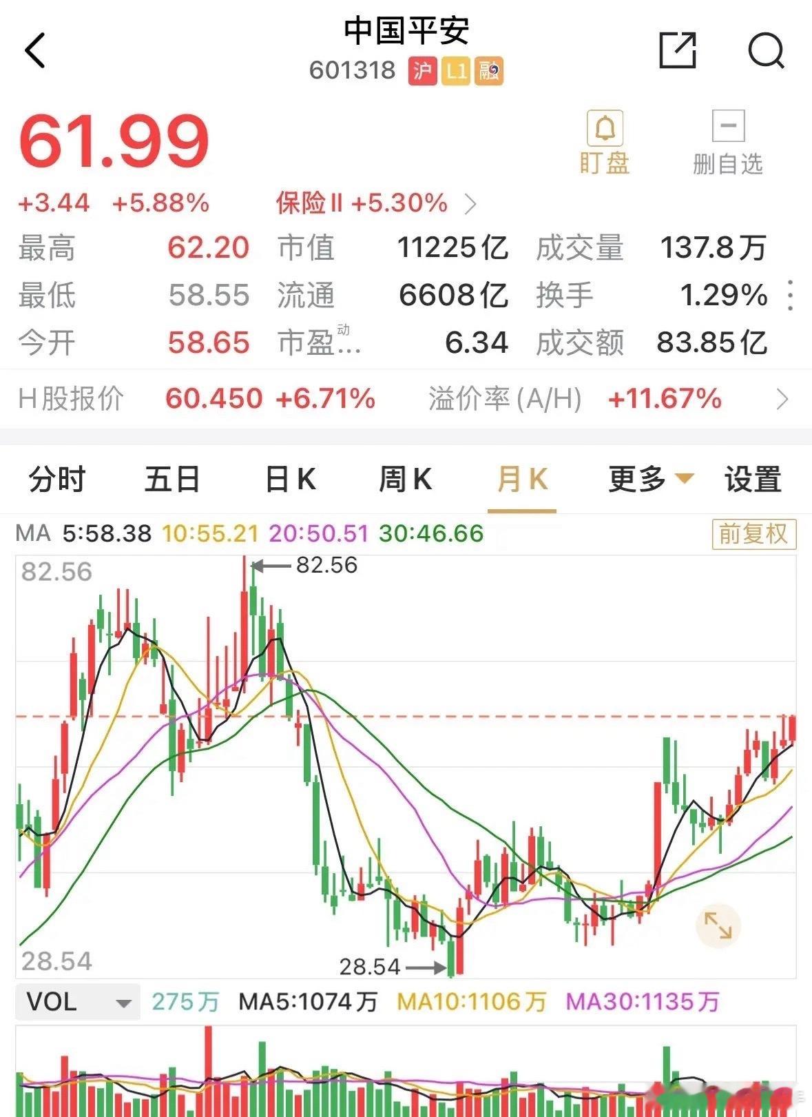 周末保险板块的强劲表现来源于盘后的消息,对保险类资金进入股市放松了年限要求,保险资金作为A股市场的重要组成部分,这有利于长线耐心资本的投资运作。这使平安保险再次成为市场的热点,午盘有资金估计提前预判,平安涨幅5.88%,收61.99元,距离11月的前高点62.27元,仅有一线之遥,创下2021年以来的收盘新高。平安目前处于多头趋势中,冲破前高之后,历史高点82.0元便近在咫尺,距离现价还有30%的空间。银行股能创历史新高,保险茅凭啥不能。月线向上突破,30%的预期空间,这会是未来三个月,对中国平安确定性强,无风险收益的正确研判否?