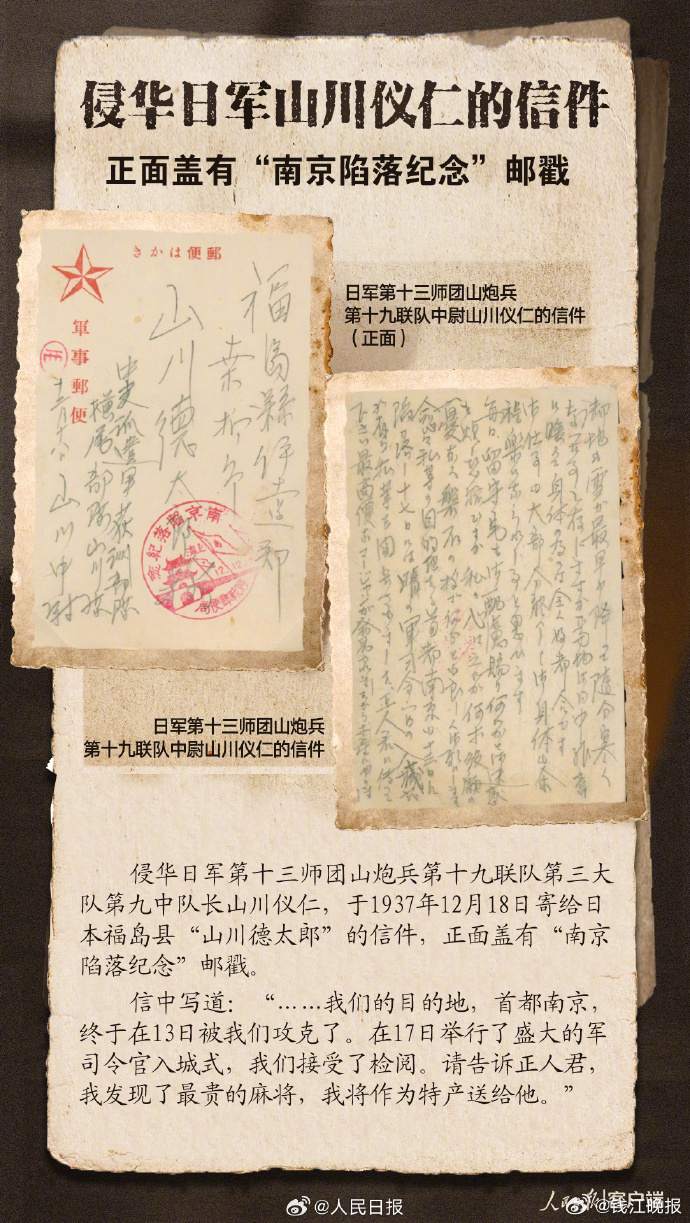 #南京大屠杀日军信中称真痛快# 【铁证如山!#南京大屠杀惨案再添新证物#】“每天都在用日本刀斩杀或射杀中国败残兵或伤兵”“日军用汽油烧毙华人、用枪尖刺死妇孺、并强奸妇女”……12月5日,侵华日军南京大屠杀遇难同胞纪念馆举行文物史料捐赠仪式。在南京大屠杀惨案发生88周年之际,一批反映侵华日军罪行的文物史料入藏侵华日军南京大屠杀遇难同胞纪念馆。南京大屠杀惨案铁证如山,不容篡改!(人民日报)