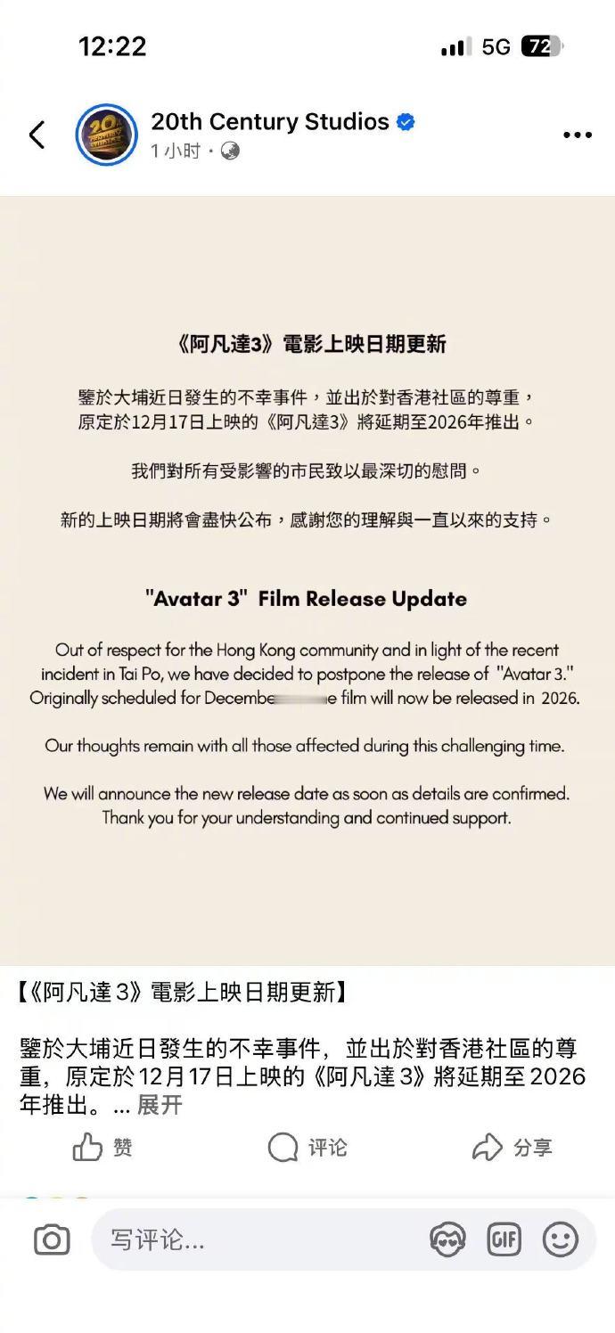 阿凡达3推迟香港上映20世纪影业港区在facebook发布消息:《阿凡达3》因近日的大埔火灾,推迟中国香港地区上映。发文也省去了该片副标题(“火与烬”)。《阿凡达3》原定12月17日中国香港上映,现推迟到2026年。