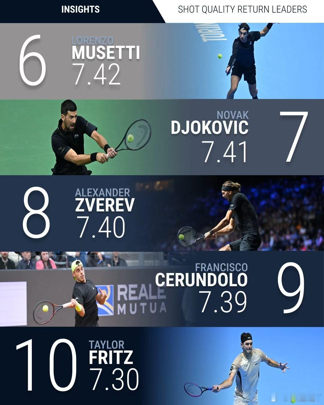 大家都知道在网球比赛中接发的重要性仅次于发球,那么在2025赛季那些球员的接发表现最出色呢?请看图。辛纳最牛逼肯定是意料之中情理之内的事情,但德雷珀排第二我是没想到。剩下的排名还有什么让你感到意外的?其实从第三到第十得分都差不了太多。