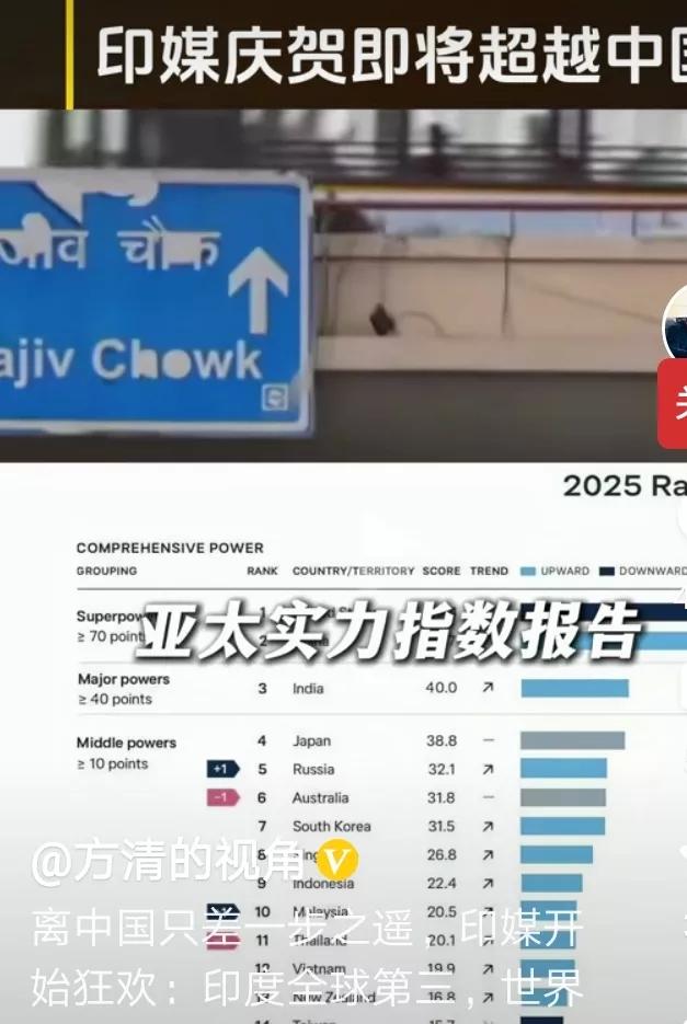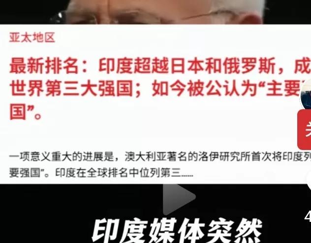 最近,印度又开始自我陶醉了。 缘由是澳大利亚洛伊智库开展了一项调查报告,涉及全球国家综合实力排名。其中,美国以89.9分的综合实力位居榜首,中国73.4分,印度则是43.2分。 洛伊智库认为,印度在5月份的印巴空战中战胜巴基斯坦,大获全胜。 该智库还表示,从全球GDP角度看,预计2025年印度GDP将达4万亿美元,而日本为5万亿美元。但就综合实力而言,日本落后于印度。 这一说法让印度人如同打了一针鸡血般兴奋不已。印度的一些高官也频繁高度评价印度的远大抱负,《印度东亚时报》等各大媒体更是争相大肆宣扬。一场自我陶醉的狂欢就此开启。
