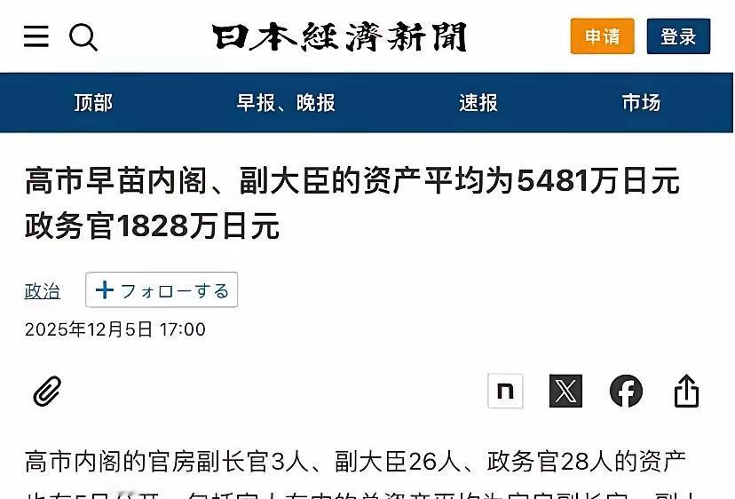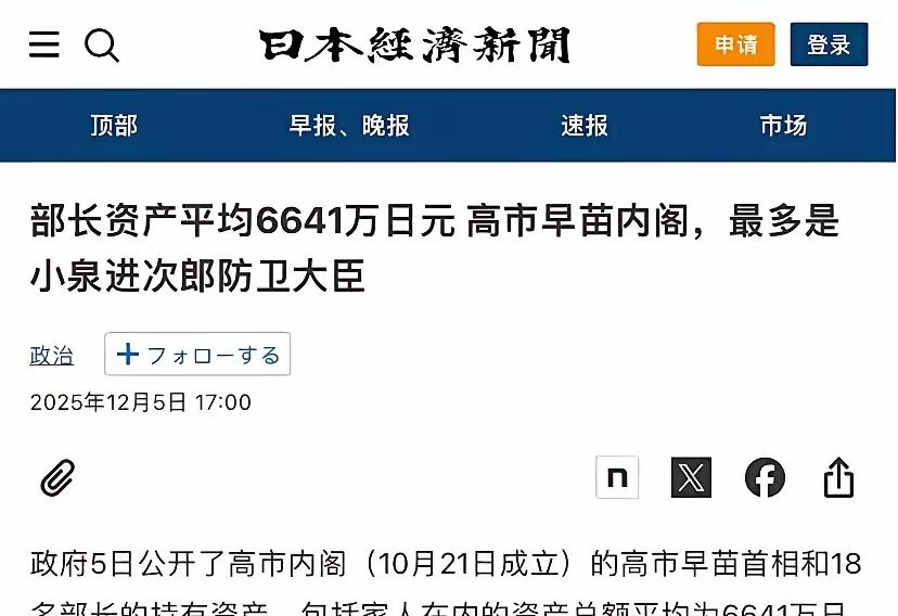 日本媒体又在炒作高市没什么钱,是一个“清廉”的首相。 日本共同社报道称:日本内阁成员集体公开财产, 首相高市早苗的总资产大约3206万日元,在包括全部的内阁大臣的排名中,只排第十位。没有有价证券和股票。 看起来非常“干净” 日本就喜欢公布内阁成员的财产,不管是石破茂还是高市早苗,公布后都是没什么钱。 作为国家首相兜里有没有什么资产,很加分。外界就会误以为他们“清廉”。 挣这么点钱,他们为啥抢着当官?她们真的为了日本鞠躬尽瘁吗? 对于这些问题是持怀疑的。3千万日元在日本东京两个40平方的一户建都买不起,高市不是“圣人”。 看她每次出席各种,不同的洋裙,不同的珠宝首饰,我认为这她公布的资产有很多的水分,符合日本一贯喜欢虚假的性格。