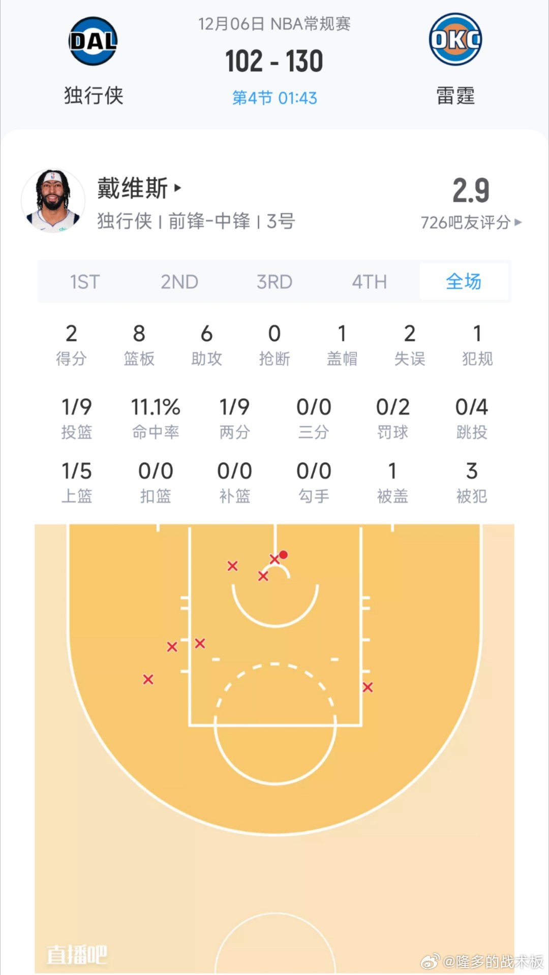 状态低迷……浓眉对阵雷霆仅得2分8板6助,投篮9中1,前三节0分🥶据统计,上次浓眉半场0分还要追溯到去年圣诞大战,当时湖人对阵勇士,浓眉首节出战7分钟伤退,也没有得分进账独行侠vs雷霆
