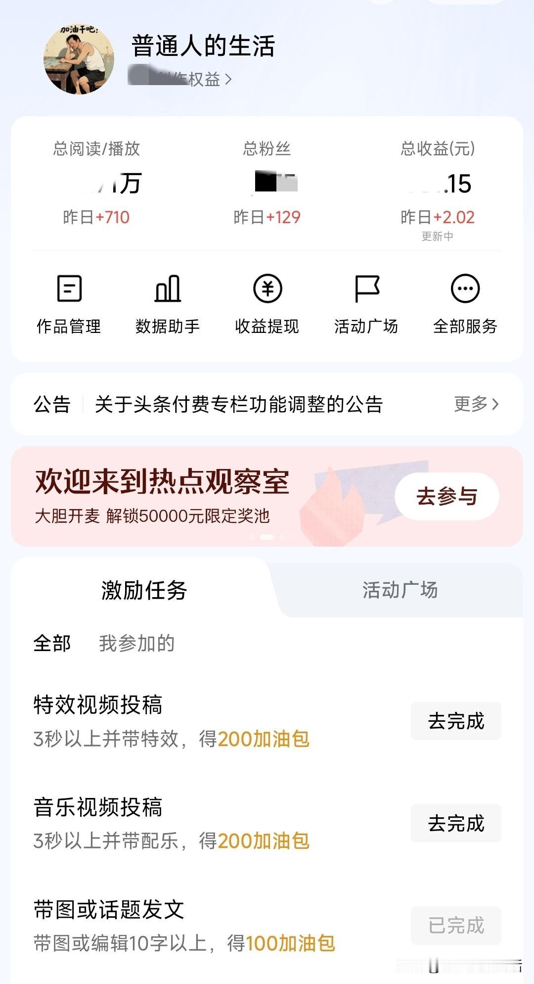 看收益 看收益了 今天的收益还可以,很满足了,不多不少正好可以买一瓶水。昨天的阅读量也是一样不足一千,但收益达到了2元多,看样子昨天的预测还真实现了。 刚刚问了客服,现在收益的关键还是要看互动率,也就是还是多增加互动环节。应该是这样,我这几天每天都会进首页推荐的朋友那里,进去阅读别人的文章,停留的时间会稍微长一点,然后点赞留言。这两天收到的回访也比较多,估计多数朋友都是根据我的评论来回访我的。有的一进来就给我的几天微头条点赞,有的甚至一连点赞五六条,我也不在乎会不会影响后面的流量。这个心态要放平和,朋友的点赞我还要谢谢别人,每条我都会点谢谢。 今天的收益破元了,说明前期的坚持有了回报,后面的创作就会更有动力了。还是那句话:头条上的创作者那么多,每天都有收益的应该没那么多,能坚持下去的更没有多少;我们并不能改变什么,但是能够改变自己。比如改变创作风格、坚持创作、每天都坚持更新,相信账号活跃度平台能够看到。还有心态很重要,我不管收益多少都不会影响我创作的心情,哪怕每天只有几分几毛,我只会做我自己,坚持写就行了。因为这个流量并不是我能控制住的,我只管写就行了。 说真的人就要知足,付出多少自然收获多少,有些东西强是求不来的。不过我现在每天粉丝都增加将近100,这个应该也是我创作的动力之一,有的朋友说这些都是僵尸粉,不会互动的,这个说真的我不在乎。毕竟自己喜欢就行了,朋友们你们说呢? 收益评论 收益准时到账 股票收益 收益分析
