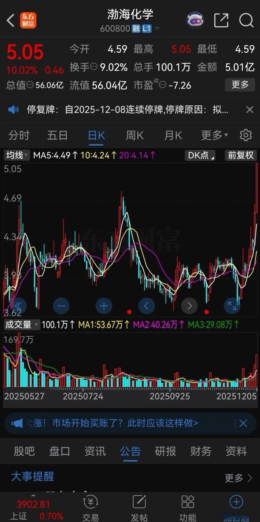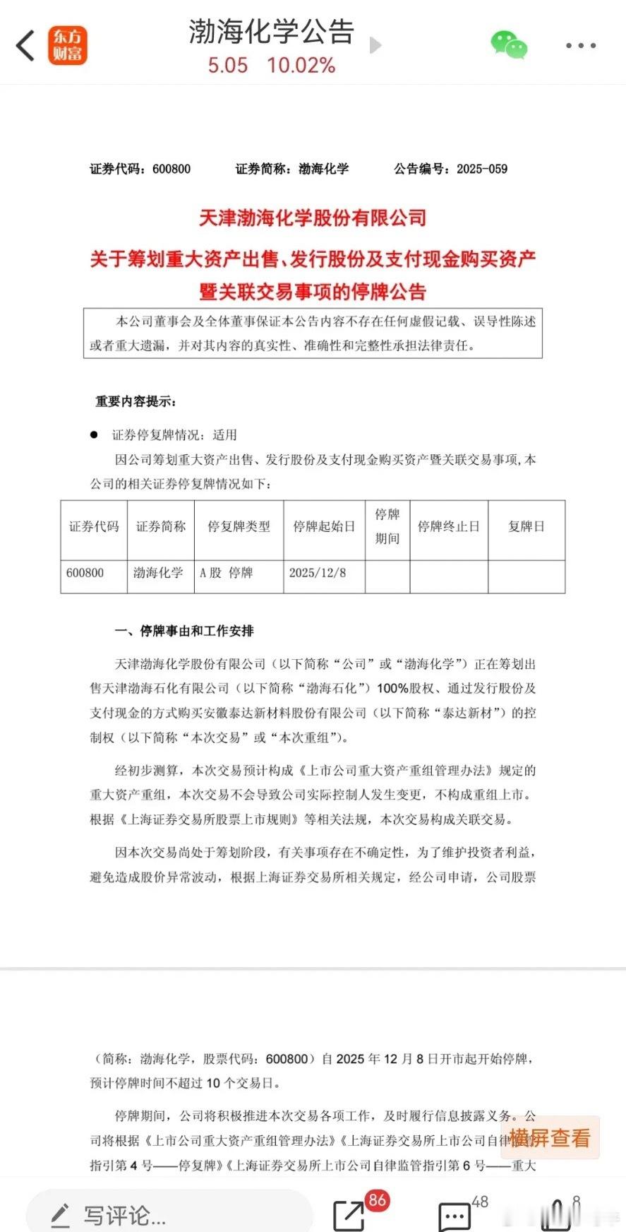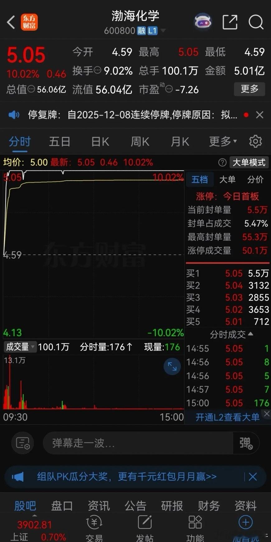 真绝!白天强势涨停,晚上发布重大资产重组!昨天渤海化学开盘直线拉升,几分钟就强势涨停封板了,直到收盘时涨停板上仍有封单5.5万手。而昨晚公司就发布重大资产重组,下周一起,开始连续停牌。从渤海化学最近两周的走势看,股价连续大涨,明显强于大盘,周四大涨6.5%,周五强势涨停封板,盘后立马公布重大资产重组。这个点,踩的非常精准,要说没有内幕,鬼都不信!