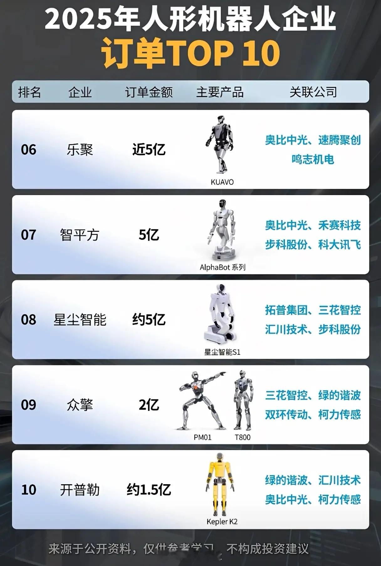 人形机器人订单TOP10有多“卷”?优必选13亿订单背后藏着哪些供应链大佬?2025年人形机器人的订单战场,已经拼出了“头部梯队”——优必选以13亿订单登顶,宇树、越疆紧随其后,前十企业订单总额超60亿,背后是一条“核心供应商绑定”的竞争逻辑。头部玩家的供应链高度集中:优必选的Walker S2,直接绑定汇川技术、绿的谐波等核心部件商;宇树的G1/G02机器人,靠绿的谐波、奥比中光撑住硬件;越疆的机械臂,则把汇川、步科股份当成“刚需配套”。这些供应商既是技术支撑,更是订单落地的“保障牌”。细分赛道也藏着共性:视觉模块几乎被奥比中光垄断,减速器离不开绿的谐波,电机则扎堆汇川、鸣志机电——人形机器人的核心部件,早已形成“几家独大”的供应链格局。订单量的差异,本质是“技术+供应链”的双重比拼:优必选能拿13亿订单,不仅靠产品力,更靠绑定了最成熟的供应链;而排名靠后的企业,要么供应链议价能力弱,要么产品场景不够刚需。人形机器人的商业化,早已从“产品比拼”变成了“供应链整合能力的较量”。