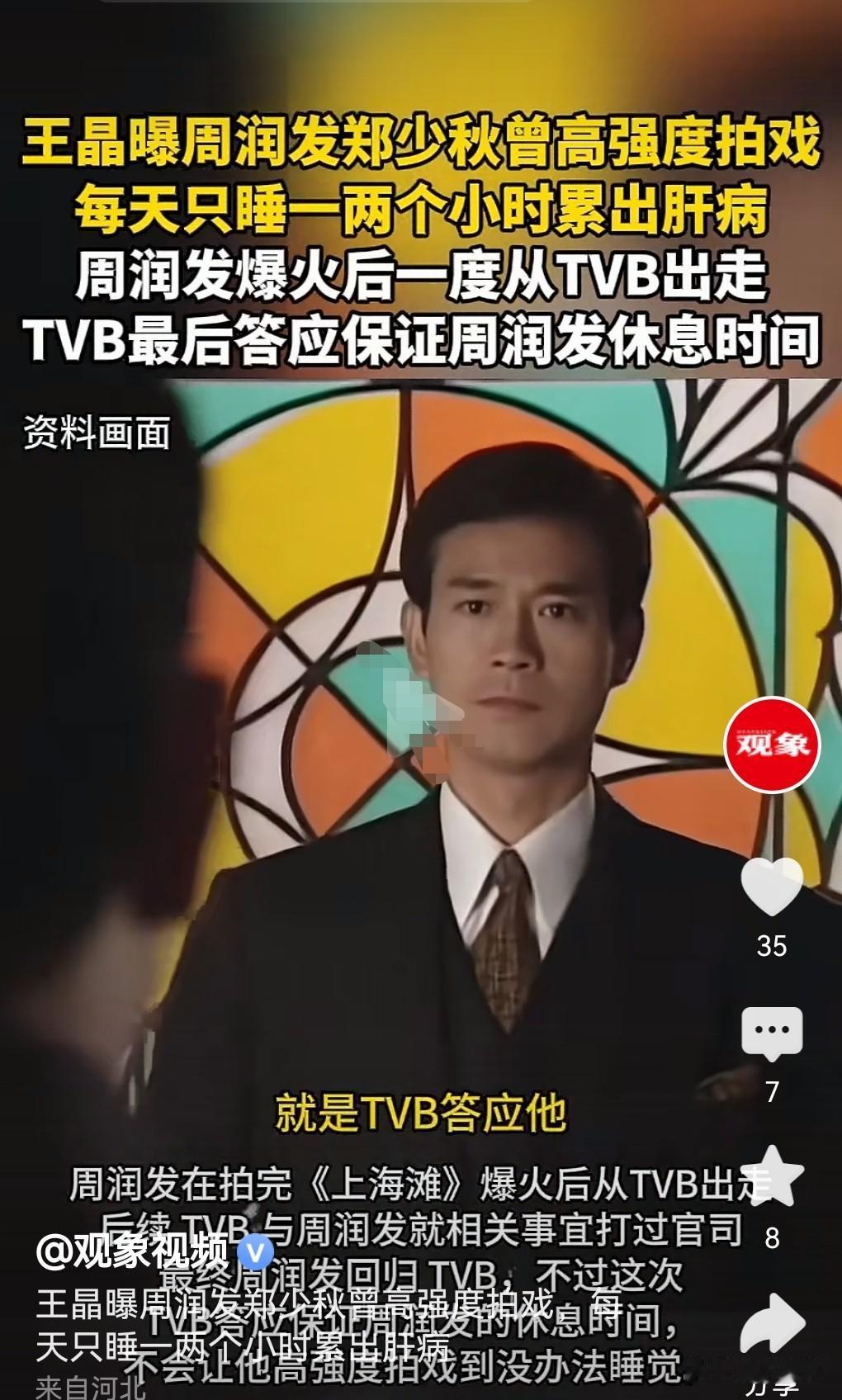 王晶爆料周润发郑少秋曾因拍戏过劳患肝病,TVB这真的是不把演员的命当人,真不怕把人给累死吗? 实在是太唯利是图了。 周润发走红后要求TVB保障休息时间才回归。 毕竟这个时候周润发影响力太大了,TVB必须妥协。 忙起来每天只能睡一两个小时。 这真是太不人道了,长期这么搞很容易猝死的。