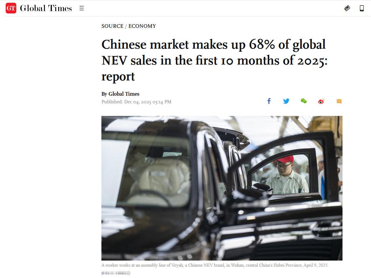 前10月中国占世界新能源车份额68% 当国外还在争论电动车靠不靠谱的时候,中国已经把全球三分之二的市场占了。今年前 10 个月,全球卖出去的新能源车里,有 68% 来自中国市场。(10 月单月甚至达 75%)。说实话,这个比例放在三五年前都不太敢想。现在再看,无论是产品节奏、供应链效率,还是价格带覆盖,中国基本就是在推着整个市场往前走。电车出海大v聊车