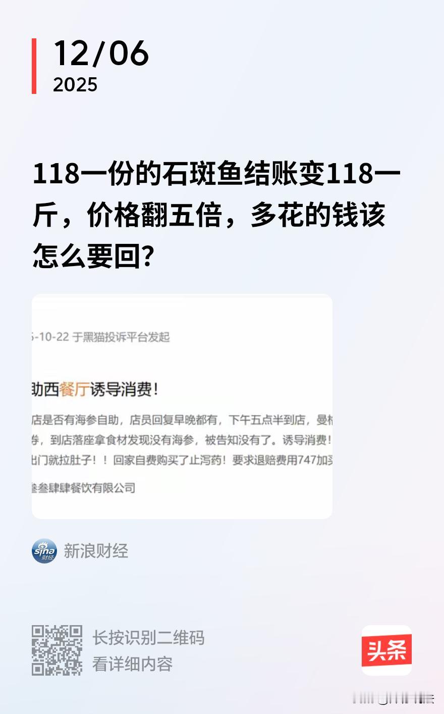广西贵港,一女子带家人在餐厅扫码点餐时,被菜单上“石斑鱼118元/份”的标示吸引而下单。不料,结账时,女子惊讶地发现账单按“118元/斤”计算,整桌消费高达5607元,仅这一道菜就比预期多出531元。女子质疑商家虚假标价,要求退还多收的钱,对方却坚持“海鲜一律按斤卖,标‘份’是显示问题”,并只愿承诺下次给予折扣。协商不成,女子向市监局投诉,但近两个月未获解决。无奈,女子在网络上爆料,餐厅态度急转。 张女士带着家人,满怀期待地来到当地一家餐厅用餐,餐厅环境尚可,服务员引导他们落座后,示意可以通过桌面上的二维码扫码点餐。 张女士拿起手机,熟练地扫码,电子菜单页面随即弹出,浏览菜单时,一道“石斑鱼”吸引了家人的兴趣。 在菜单清晰的展示页面上,这道菜的配图诱人,旁边标注的价格是 “118元” ,紧随其后的计价单位,明确无误地写着 “一份” 。 在张女士及其家人的普遍认知和日常消费经验中,餐厅菜品,特别是此类已加工烹制的菜肴,通常以“份”为计价单位,标明一份的价格,就意味着这是享用这道菜品的总费用。 基于对菜单标识的信赖,他们点下了这份“118元”的石斑鱼,同时搭配了其他菜肴。 餐毕,家人对菜品还算满意,直到服务员递上最终的消费账单,张女士核对时,笑容瞬间凝固了。 账单总额高达5607元,这远超了张女士的心理预期,她立刻逐项仔细查验,目光最终锁定在那道石斑鱼上。 账单明细显示,石斑鱼的计价方式赫然变成了 “118元/斤” ,并且根据所称重量,累计计算出了一个远高于118元的费用。 张女士向收银员提出质疑:“等一下,我们点的时候,菜单上明明写的是118元一份啊!” 收银员语气平淡地解释:“女士,我们家所有海鲜都是按‘斤’卖、按‘斤’称重计费的,没有按‘份’卖的。” 张女士感到难以置信:“按斤?可是我们点餐的时候,扫码看到的菜单,白纸黑字写的就是‘一份’!如果按斤卖,那一份是多少斤?为什么点的时候不说明?” 张女士当即要求查看点餐时手机上的菜单记录,确认自己并非记错。 然而,此时无论是电子菜单界面,还是可能存在的纸质备查菜单,其显示的“一份”与账单上的“一斤”,构成了尖锐的矛盾。 粗略计算下来,按“斤”收费使得这道石斑鱼的实际价格,比起他们点单时理解的“份”价,暴涨了约五倍,仅这一道菜就被多收取了531元。 张女士感到一股怒火涌上心头,认为餐厅存在故意误导的嫌疑。 张女士当场向餐厅经理提出交涉,要求多收的531元应当立即退还。 然而,餐厅方面的态度坚决,认为海鲜从来都是按斤卖的,这是行业规矩,而菜单上可能显示有误,但按斤计价是肯定的,不能退钱。 为了安抚顾客,经理甚至提出“下次光顾可以给予折扣”的所谓解决方案。 但张女士拒绝这种毫无诚意的“补偿”,坚持要求退还多收的款项。 在餐厅现场交涉无果后,张女士进行了投诉,但始终没有结果。 无奈之下,张女士求助媒体爆料,引发热议。 餐厅关注到这个情况后,主动联系了张女士,迅速表达了歉意,并将多收的531元全额退还给了张女士。 那么,从法律角度,这件事如何评价呢? 《价格法》第十三条规定,经营者销售、收购商品和提供服务,应当按照政府价格主管部门的规定明码标价,…… 《明码标价和禁止价格欺诈规定》第六条规定,经营者应当以显著方式进行明码标价,明确标示价格所对应的商品或者服务。 本案中,餐厅在交易前标示的计价单位为“份”,在交易后却按“斤”结算,这种“前后不一致”的操作,直接违反了明码标价必须“真实明确”、“标示醒目”的基本要求。 “份”与“斤”在法律和普通消费者认知中是两种截然不同的计价模式,其导致的支付金额差异是巨大的。 所以,如查实餐厅也未在餐厅内明码标示价格,则其电子显示错误的辩解不能免除其责任,市监局依法可以对其采取罚款处罚。 此外,餐厅的行为涉嫌构成“价格欺诈”,其“行业惯例”抗辩于法无据。 《明码标价和禁止价格欺诈规定》第十九条 经营者不得实施下列价格欺诈行为:……(四)销售商品或者提供服务时,使用欺骗性、误导性的语言、文字、数字、图片或者视频等标示价格以及其他价格信息;…… 具体到本案,餐厅在点餐环节,仅标示“118元/份”,完全隐匿了“按实际称重斤两计算”这一关键条件,或通过使用“份”这一与最终结算方式(斤)不符的单位,让张女士产生了错误认识,促成了交易。 可见,餐厅的行为已超出一般的“标价失误”范畴,其模式具有明显的误导性和欺骗性,涉嫌构成价格欺诈。 结合《消费者权益保护法》第五十五条规定,张女士作为消费者,有权主张退一赔三,即要求退还多收的531元,并增加赔偿损失1593元。 对此,您怎么看?