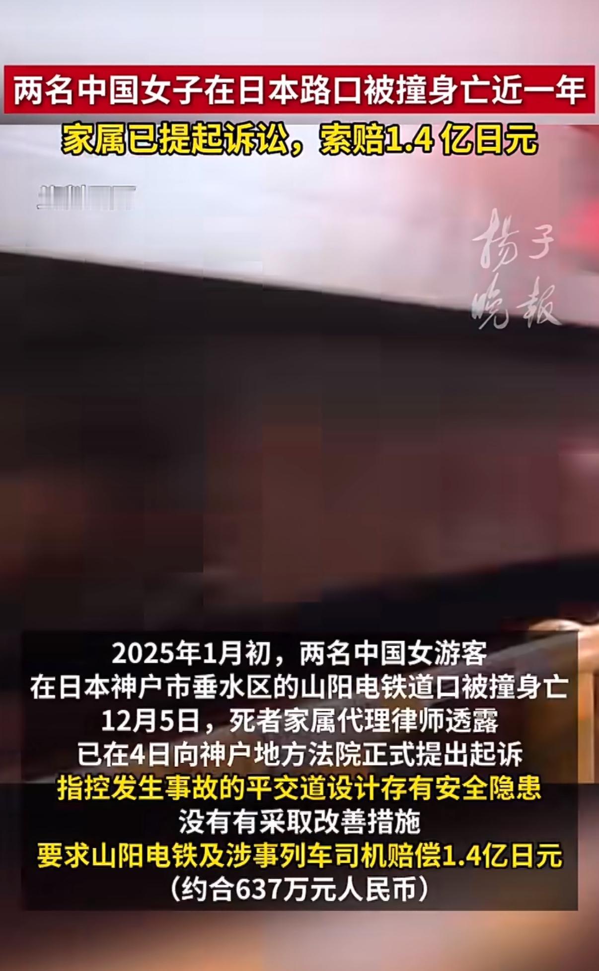 两条年轻的生命永远留在了日本的铁道口,家属索赔637万的消息一出来,瞬间戳中了无数人的心。事情其实不复杂,两名二十多岁的中国女孩去日本旅游,在神户一个铁路道口等红绿灯过马路时,误入了栏杆内侧的区域,结果被疾驰而来的电车撞了,当场就没了。时隔近一年,痛不欲生的父母把铁路公司和司机告上了法庭,要求赔偿1.4亿日元,换算成人民币就是637万。 为啥家属会坚持索赔?那个道口本身就有大问题,当地居民都叫它“死亡道口”——等待区域窄得只能容下两个人并肩,还是个斜坡,稍微不注意就可能靠近铁轨。更坑人的是,那里的安全警示只有日语,咱们不懂日语的游客根本看不懂,而且之前就出过好几次致命事故,铁路公司却一直没好好整改。家属说,司机本应该在150米外就观察道口情况,可直到离得很近才发现人,也没及时鸣笛;女孩们是第一次来,误把道口里的黄色区域当成了安全等待区,根本不是故意冒险。更让人无奈的是,事故后日本相关部门也承认道口有安全隐患,还启动了改造工程,这难道不说明铁路公司早就该负责吗? 很多人觉得索赔金额太高,甚至有日本网友说“这是责任转嫁”,可换位思考一下,换做谁的女儿突然没了,能甘心吗?那不是钱的问题,是想为逝去的孩子讨个公道。两个女孩正是最好的年纪,本来有着光明的未来,却因为一个本可避免的安全隐患没了性命,对两个家庭来说,天直接塌了。父母养孩子二十多年,付出的心血不是金钱能衡量的,索赔背后是他们的不甘和痛苦。 再说了,铁路公司真的没责任吗?接待那么多外国游客,连个多语言警示都没有,明知道口危险还不整改,这就是没尽到安全保障义务。咱们去国外旅游,是为了看风景,不是去闯鬼门关。别说游客可能不熟悉当地规则,就算再小心,遇到这种设计有问题的道口,也容易中招。那些说“电车来了要避让是常识”的人,根本没考虑到环境误导的问题,换成谁在那个狭窄又没明确提示的区域,都可能判断失误。 出境游的安全从来都不是小事,既需要我们自己提前了解当地规则,更需要目的地做好保障。铁路公司如果早一点整改隐患、多设一个中文提示,或许这场悲剧就不会发生。家属的索赔,其实也是在提醒所有运营方,安全没有侥幸,生命容不得敷衍。 不知道你怎么看这件事?是觉得家属索赔合理,还是觉得双方都有责任?欢迎在评论区说说你的想法。 来源;扬子晚报