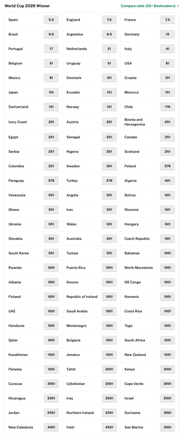 2026世界杯夺冠赔率TOP11 西班牙 5.5 英格兰 7.5 法国 7.5 巴西 9.5 阿根廷 9.5 德国 15 葡萄牙 17 荷兰 21 意大利(暂未出线) 41 比利时 51 乌拉圭 51